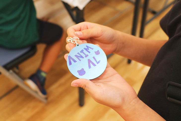 子どもたちは、チタンの色が変わるしくみや制作手順を学んでから、自身でチタンプレートにつける色を考え、シールを貼ってオリジナルの図版を作成。