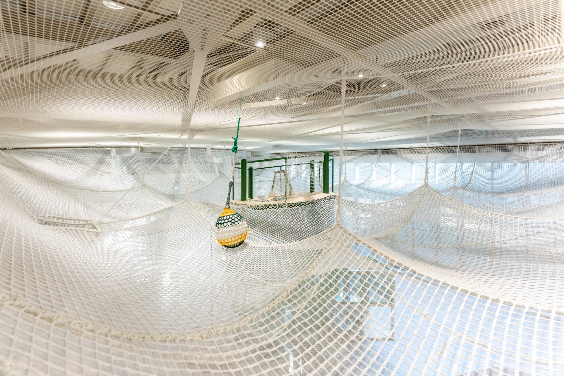 立体的に張り巡らされたネット遊具は、身体を使って登る・くぐる・跳ねるといった動きを通じて、身体的知能を刺激します。また、高低差や構造を把握しながら移動することで、空間的知能にも働きかけます。さらに、「みんなのネット」では車椅子の子どもも利用できる設計としており、天空ネットの揺れや振動を通じて他者の存在を感じ合い、ともに遊ぶ体験を生み出します。多様な子どもが同じ空間で遊びを共有できる設計です。