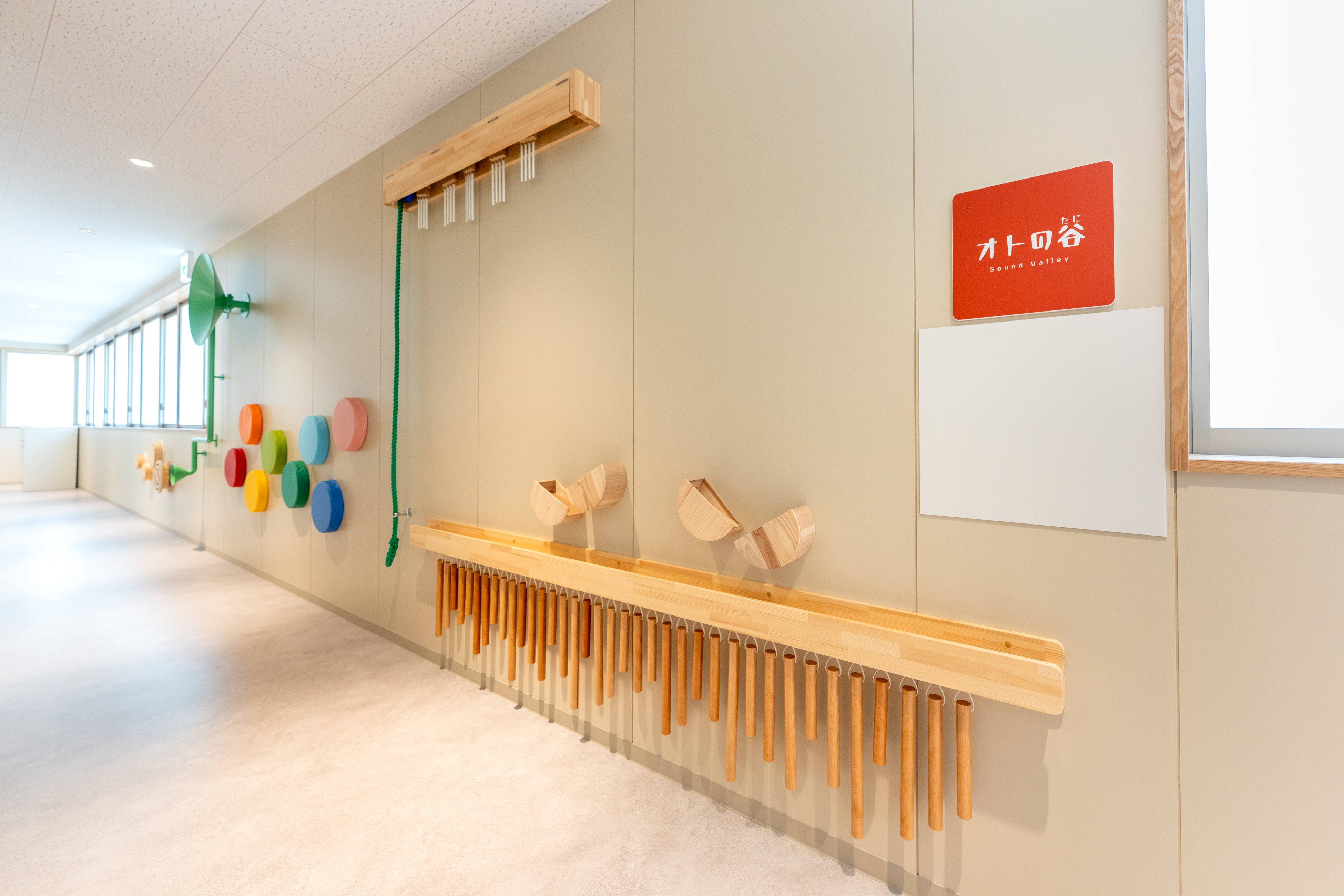 音やリズムを体験できる「オトの谷」では、音楽的知能を中心に子どもの感性や表現力を刺激します。単に音が出るだけでなく、施設の奥で奏でた音が空間全体に響き渡るよう設計されています。音の広がりや響きを体感することで、音への気づきや空間認識の発達にもつながります。