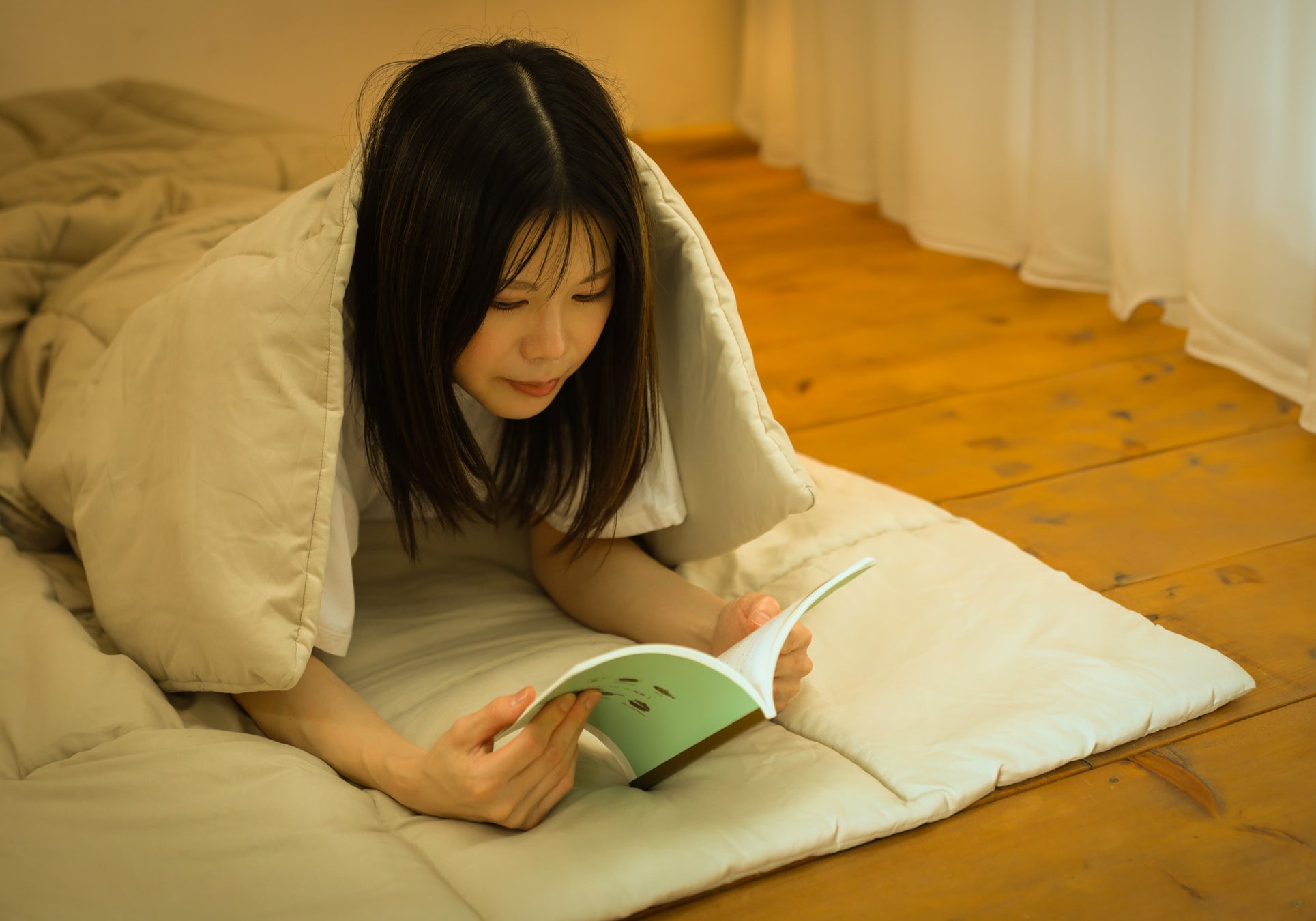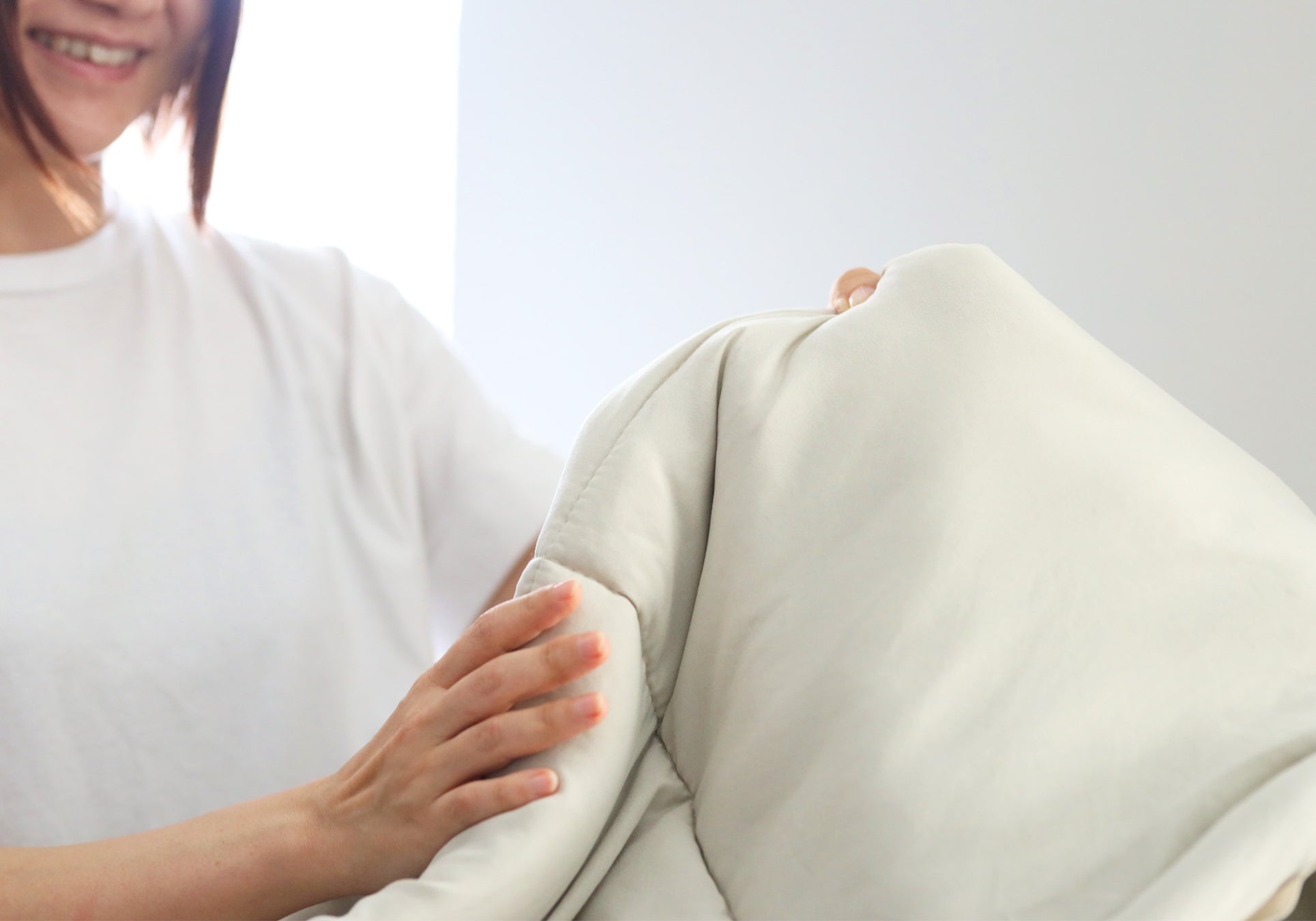 いつでもどこでも心地よい寝心地を体感できるよう、掛け布団側6 : 敷布団側4の割合で綿量を調整しており、気温に合わせてお好きな面を掛け布団としてお使いいただくことができます。生地にはいつまでも触れていたくなるような、肌触りの良いコットンタッチ素材を採用。中綿は保温性に優れた中空糸綿を使用し、安眠できる適度な布団の重さと柔らかな質感を実現しました。