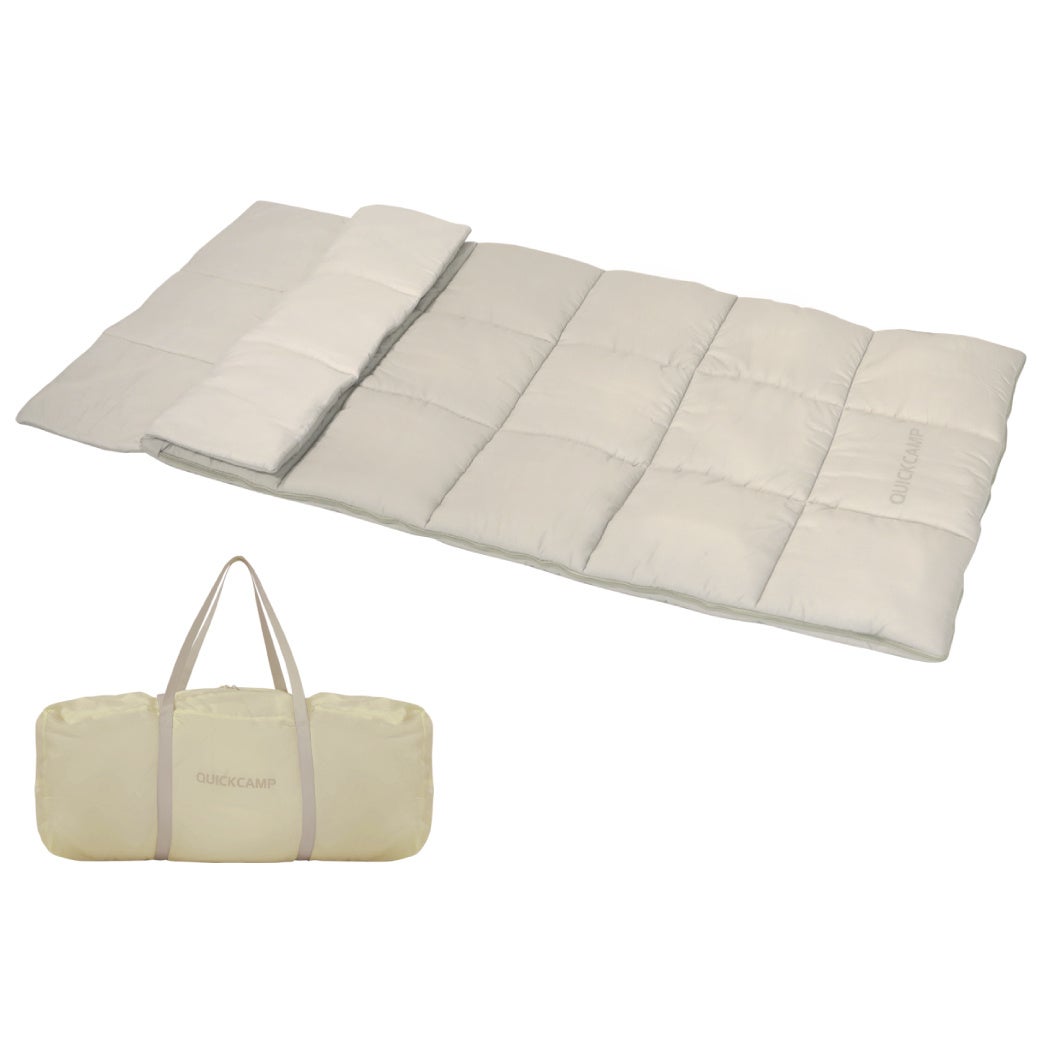 初めて使うのに、自分の寝具に包まれているような安心感とリラックス感。布団のように重くてかさばることはなく、寝袋のサッと取り出して片付けまで簡単に扱えるクイックさをそのまま採用。QUICKCAMPが提案する、布団よりも気軽に、そして手軽に使える新しいサブ布団。きっと一度使えば、その快適さと便利さの虜になるはず。