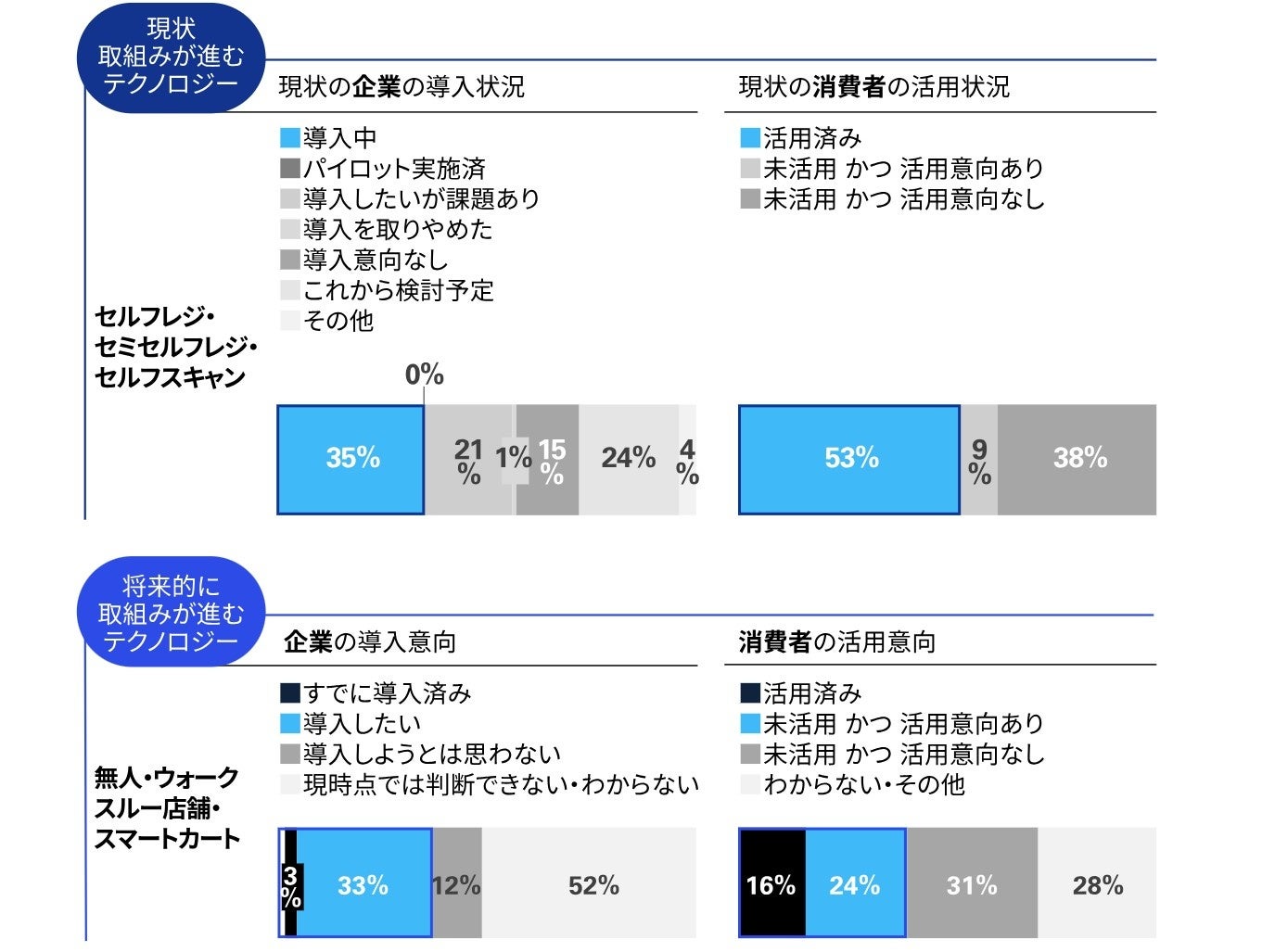 企業側の導入状況を上回る形で消費者の活用状況が上回ったテクノロジーの1つとして、「セルフ化や無人店舗」があげられる(導入中の企業:35%、活用済みの消費者:53%)。