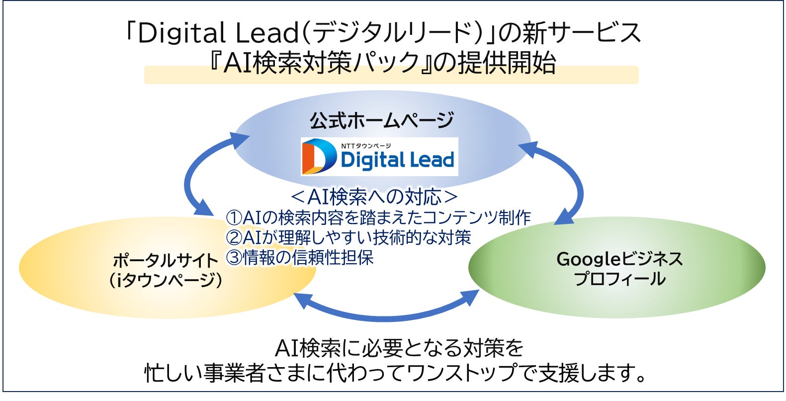 NTTタウンページ株式会社(本社:東京都中野区、代表取締役社長:村田和也)は、2025年11月10日(月)より、AI検索に対応した「Digital Lead」の新サービス「AI検索対策パック」の提供を開始します。