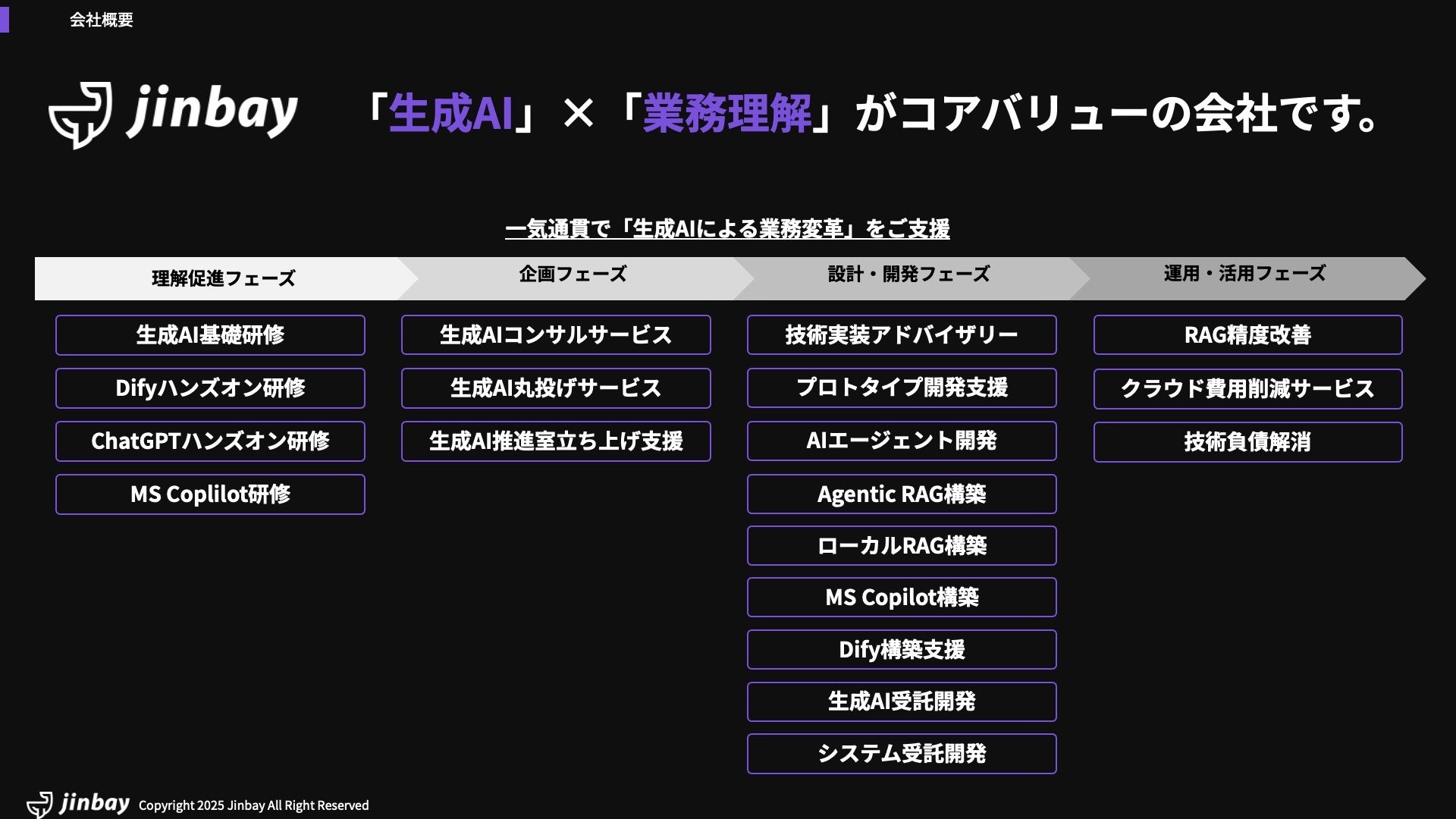ジンベイ株式会社は「テクノロジーで”退屈な仕事だけ”を奪う」をミッションに、最新の生成AI技術を活用した業務DXを推進しています。