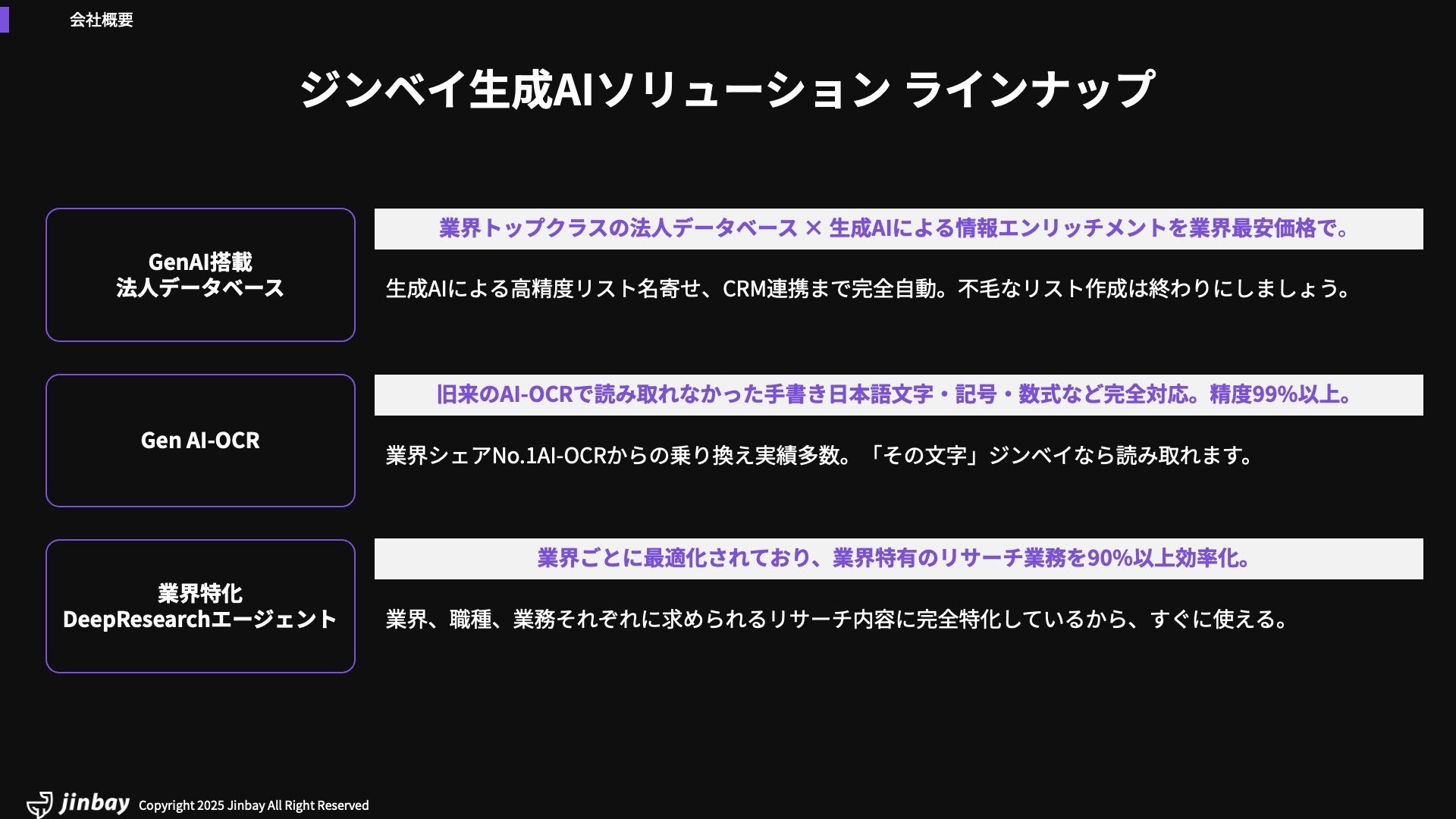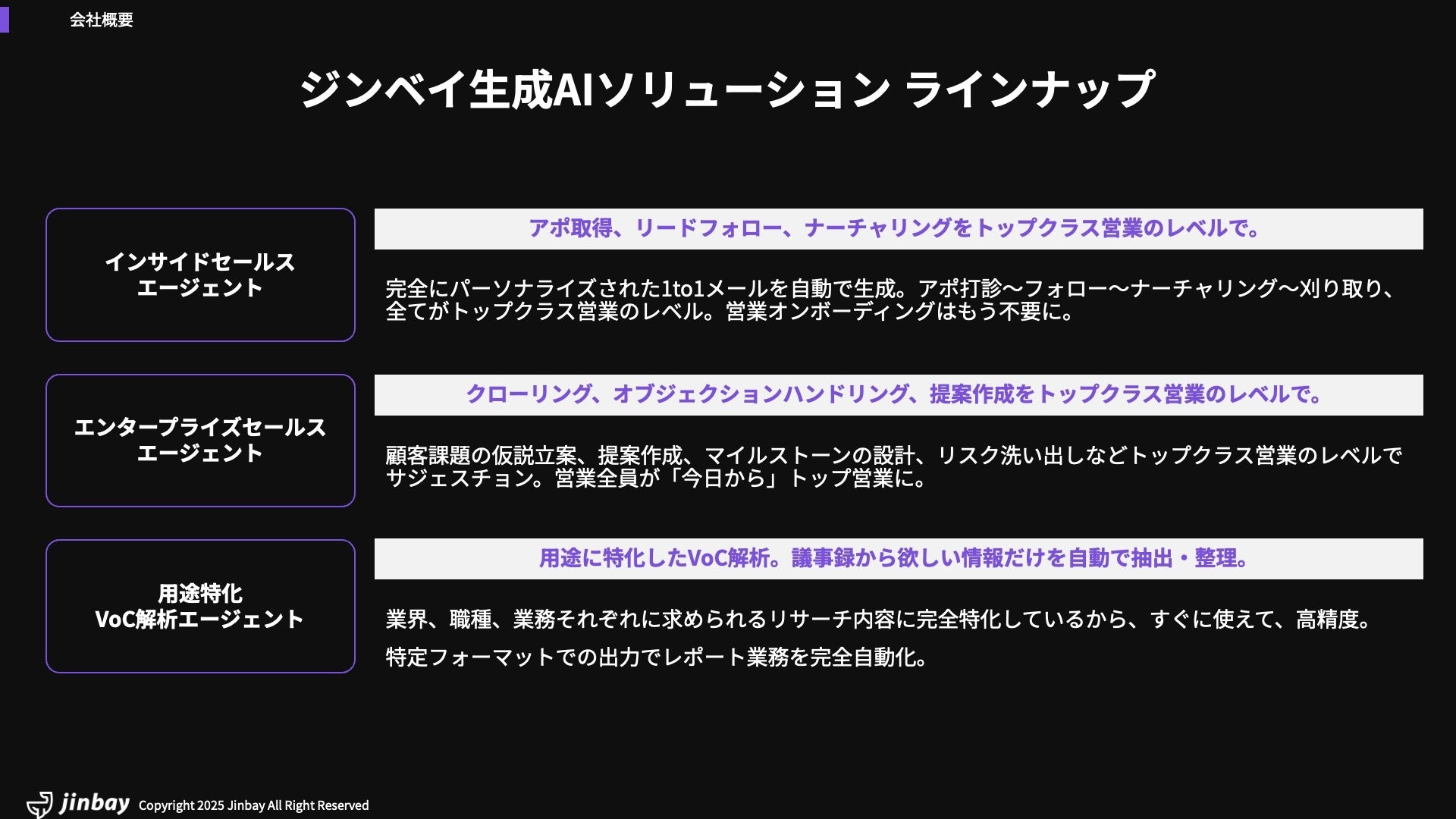 ビジネス課題に特化したAIソリューションを提供し、業務の効率化と精度向上を実現。名刺情報のデータ化、見積作成、商品価格設定など、業務ごとに最適化されたエージェントを展開します。