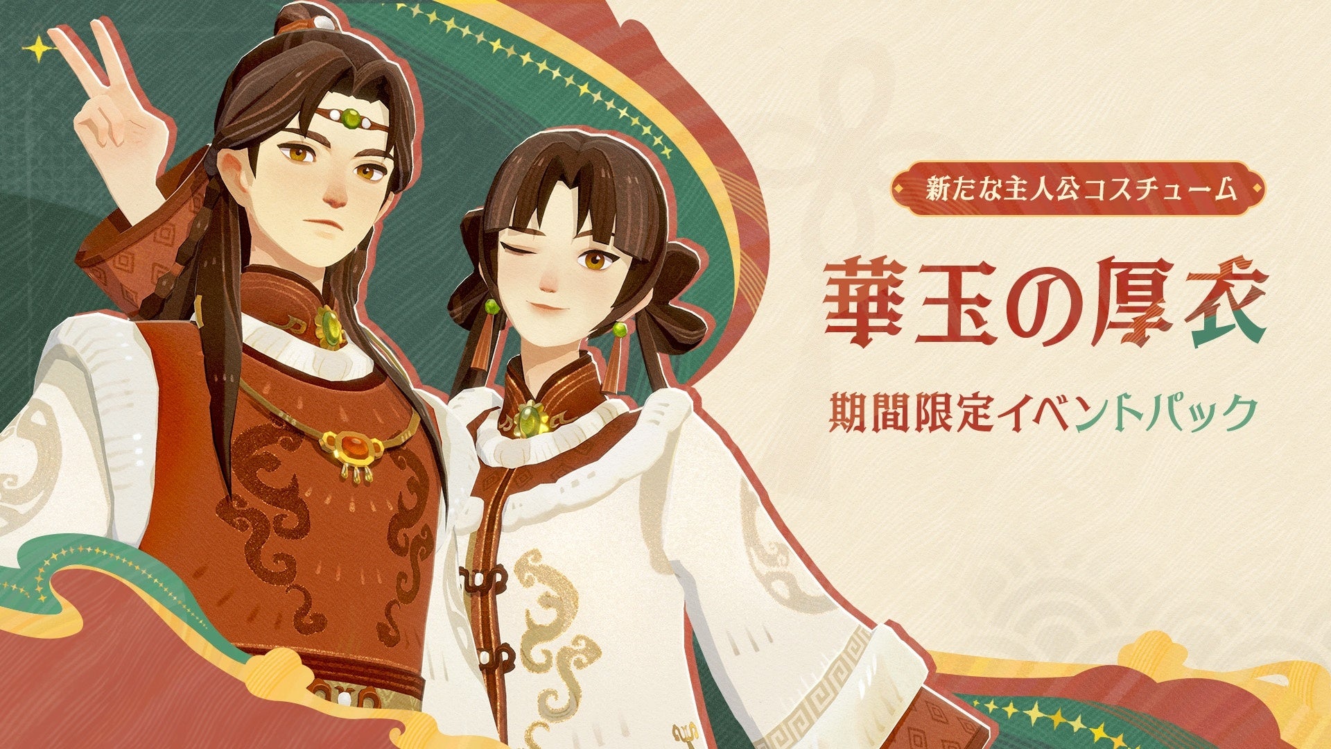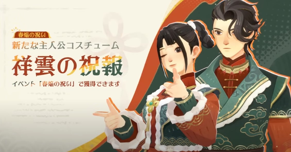 イベント「春祭の祝い」をプレイすることで、イベント期間中に新主人公コスチューム「祥云の祝報」を限定入手可能!さらに、主人公コスチューム「華玉の厚衣」も購入可能!