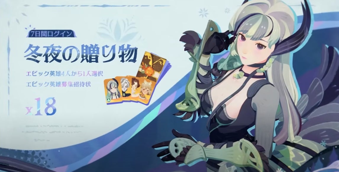 毎日ログインすると合計18枚の「英雄募集招待券」がもらえ、7日目には「エピック英雄選択箱」が手に入ります!