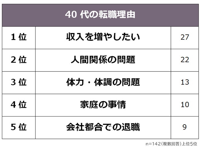 40代で転職経験のある142人に転職理由を聞いたところ、1位は「収入を増やしたい(27人)」です。