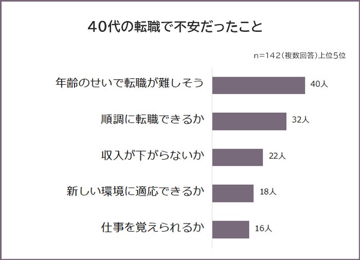 40代の転職で不安だったことの1位は「年齢のせいで転職が難しそう(40人)」、2位は「順調に転職できるか(32人)」でした。以下、3位「収入が下がらないか(22人)」、4位「新しい環境に適応できるか(18人)」、5位「仕事を覚えられるか(16人)」が続きます。