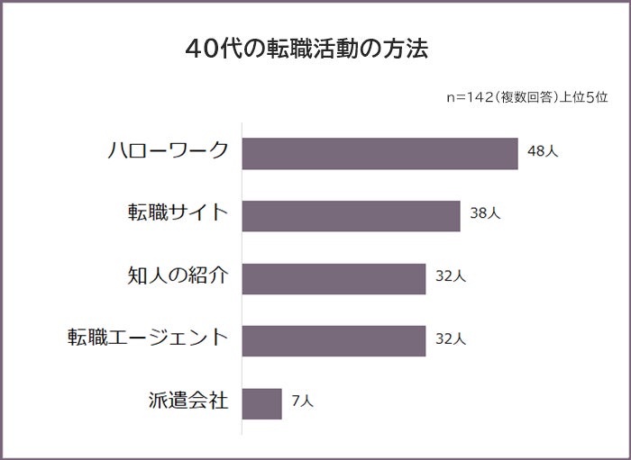 どのような方法で転職活動を行ったかを聞いたところ、最も多かったのは「ハローワーク(48人)」でした。以下、2位「転職サイト(38人)」、同率3位「知人の紹介(32人)」「転職エージェント(32人)」、5位「派遣会社(7人)」の結果でした。