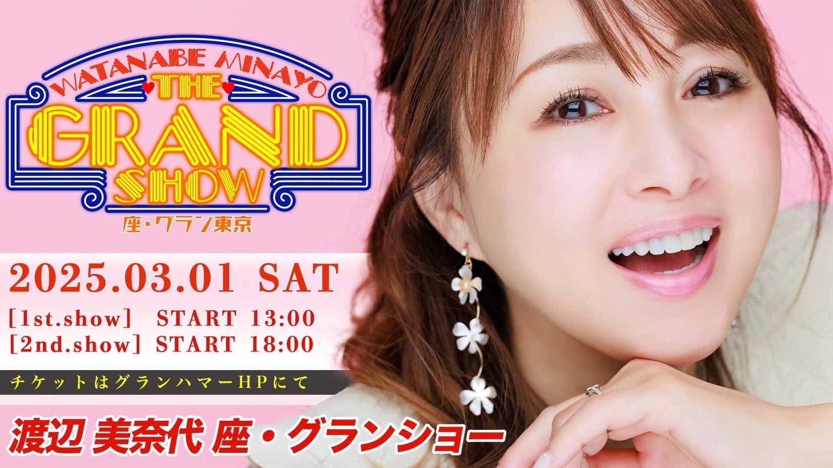 当社史上最大規模のフードエンターテインメントレジャービル『グランハマー』内3階『座・グラン 東京』では、アーティストやパフォーマーによるエンターテインメントショーを連日開催しており、2025年3月1日(土)にてアーティストの渡辺美奈代さんが出演する「渡辺美奈代 座・グランショー」の開催を決定いたしました。本公演では、 80年代を代表するスーパーアイドル“おニャン子クラブ”の中でも元祖正統派アイドルとしてそのキュートさで不動の人気を誇り、ソロデビュー後も数々のヒット曲を発売しオリコン記録を塗りかえた「渡辺美奈代」のライブをお楽しみいただくとともに、この日限りのスペシャルメニューとして芸能界屈指の料理上手で知られるご本人監修のお食事をお楽しみいただけます。公演は1stステージが13:00スタート、2ndステージが18:00スタートとなっております。