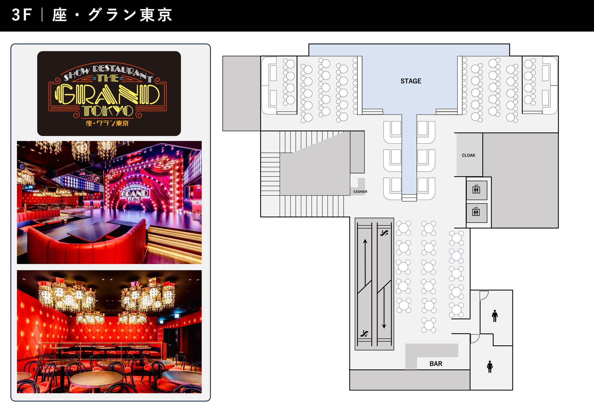 本公演は『グランハマー』の中でもエンターテインメントを体感いただける3階『座・グラン東京』にて実施いたします。中央に設置されたステージは、アーティストやイリュージョニスト、格闘技など多目的に使用できる仕様です。そして通常のライブハウスやコンサートホールとは異なり、間近で体感できるライブ演出が特徴となっています。なお、3階と4階は吹き抜け構造になっているため、4階『グランカフェラウンジ』でもライブの空気感を体感いただきながら、お食事をお楽しみいただけます。