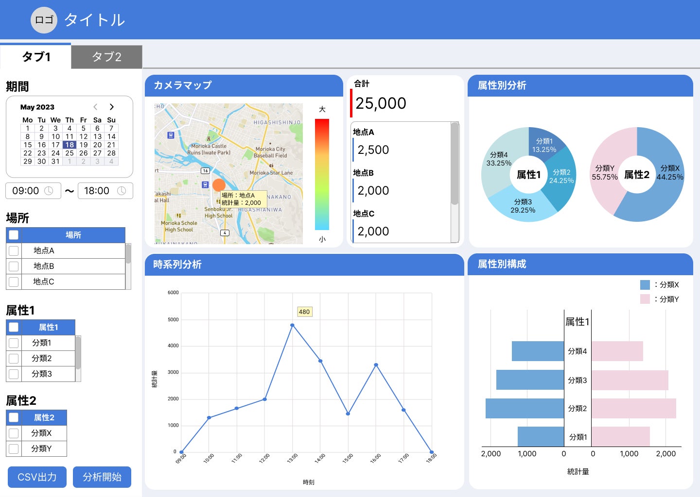 ・ダッシュボードで可視化:混雑マップ、属性分析、時系列分析などを提供。