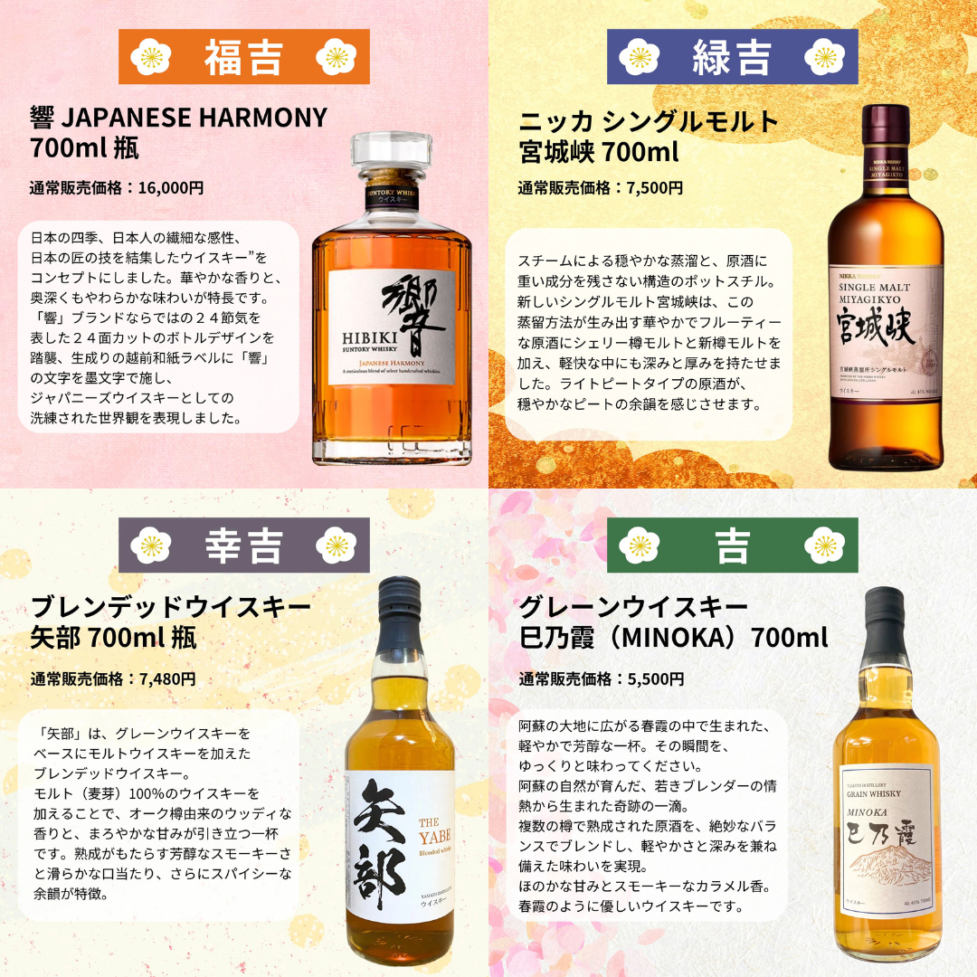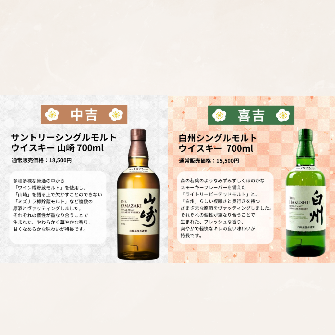 大大吉には「山崎12年」、大吉には「白州12年」を封入し、計5本の長期熟成ボトルをラインアップしました。
