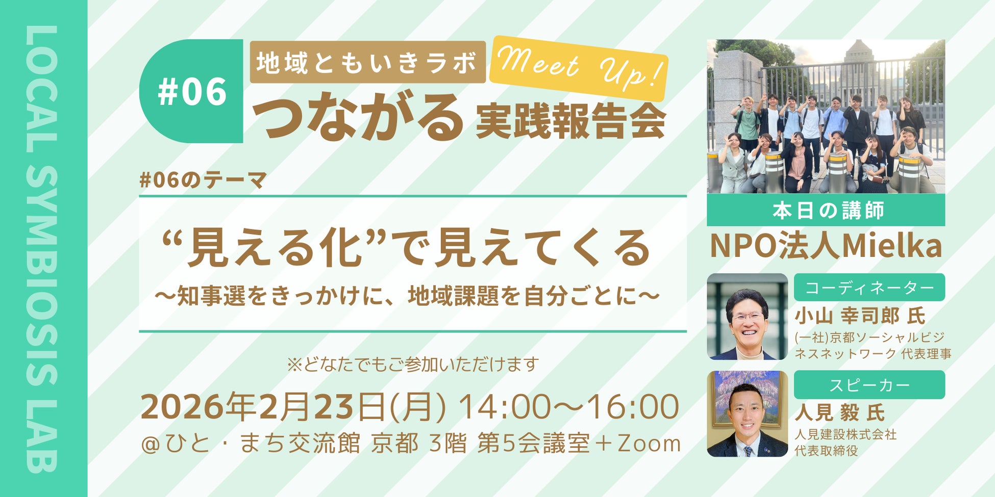 「地域ともいきラボ」は、2026年2月23日(祝・月)に、大学生主体のNPO法人Mielkaをメインゲストに迎えた実践報告会「“見える化”で見えてくる ~知事選をきっかけに、地域課題を自分ごとに~」を開催いたします。