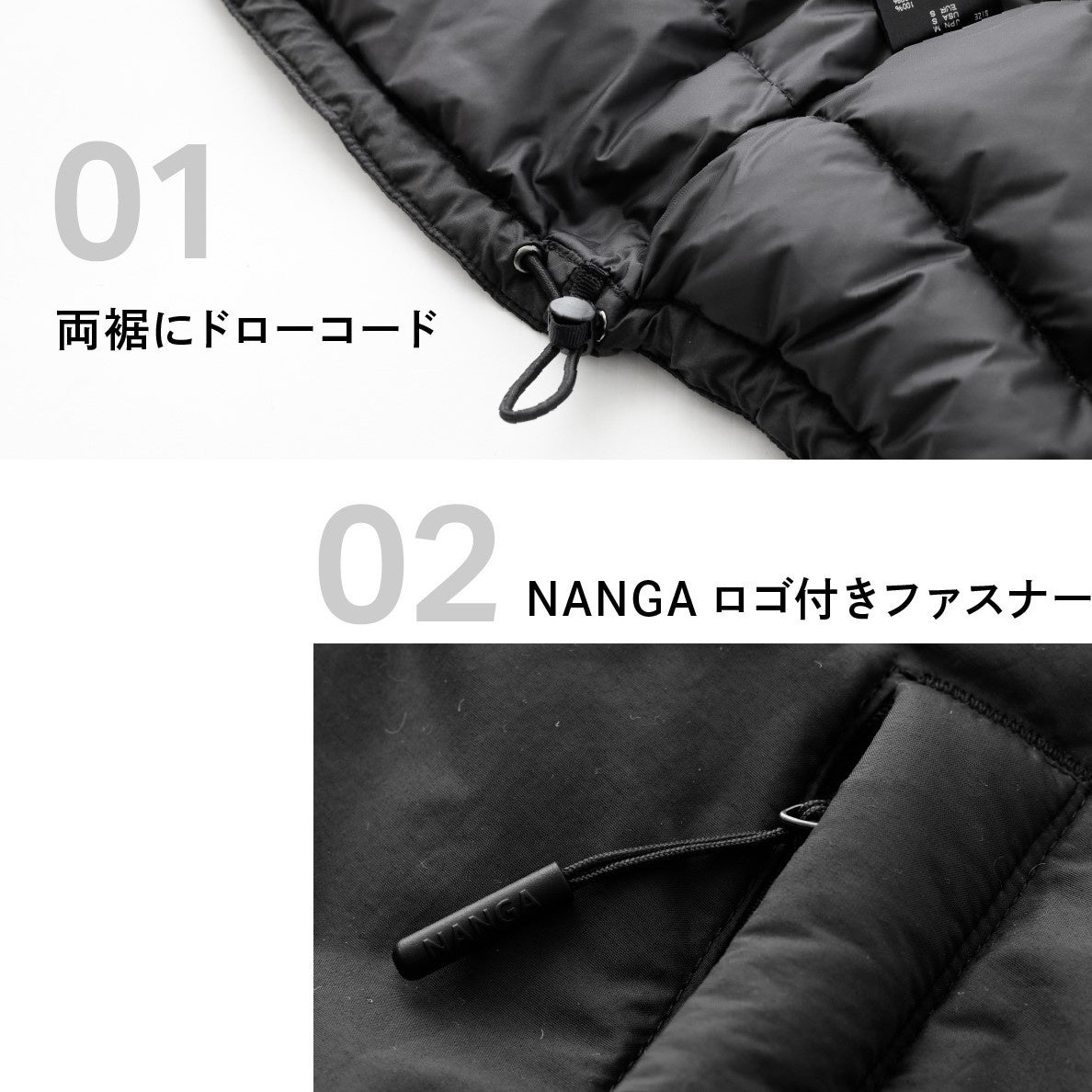 NANGAは、限りある資源であるダウンをメーカー問わず回収し、国内最高峰の羽毛加工メーカー「河田フェザー」で洗浄、精製したリサイクルダウンを積極的に使用しています。インナーダウンベストは中綿にこのリサイクルダウンを使用したエコフレンドリーなモデルです。リサイクルダウンは電子顕微鏡レベルで見ても一般の新毛より清潔で、さらに高品質の700フィルパワーで快適な保温性を確保します。