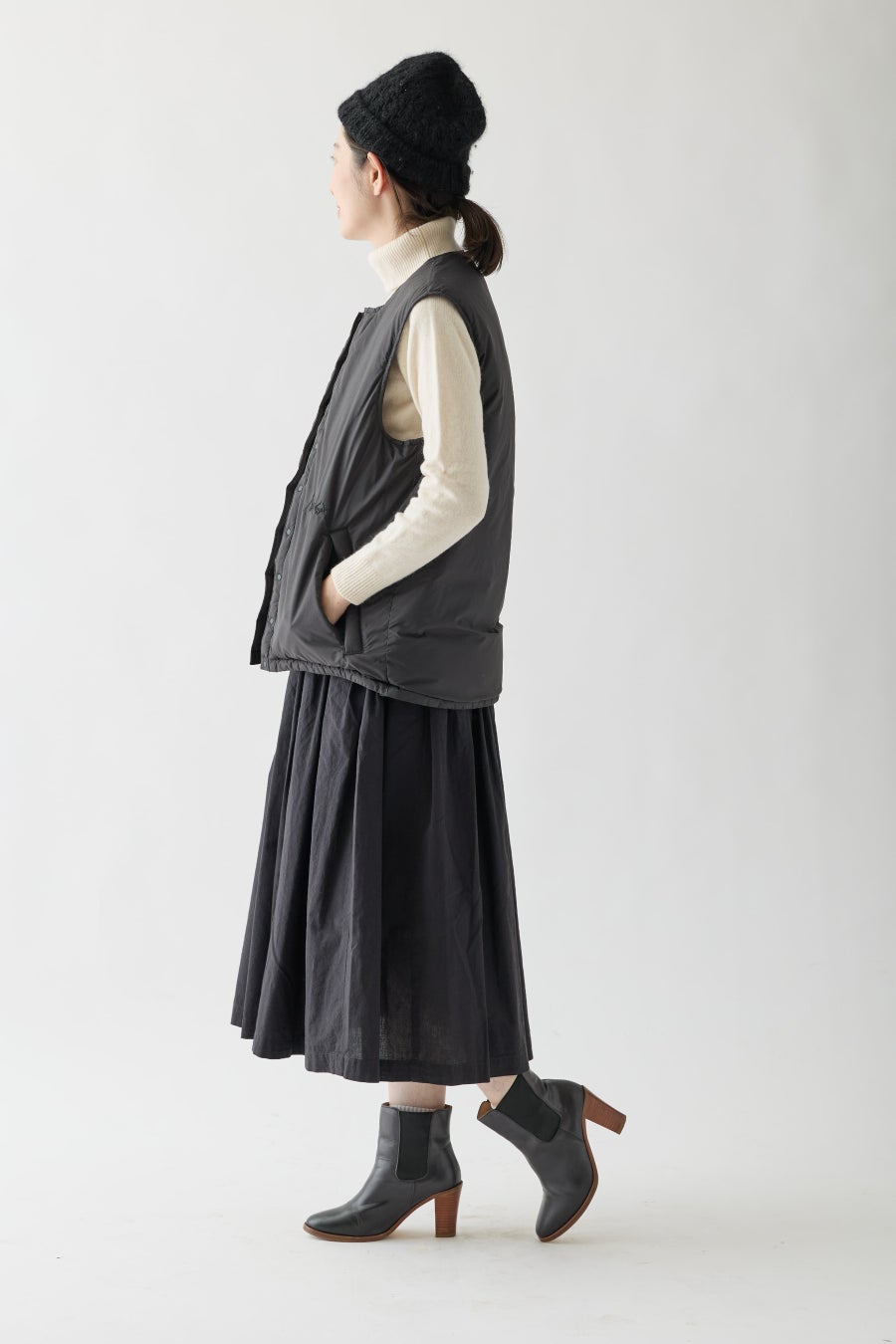 インナーとしてだけでなく軽アウターとしても使えるベーシックなフォルムのダウンベスト。カジュアル感を抑える為にダウン特有のステッチを表生地に出さない仕様で、ビジネスやタウンユースに最適です。