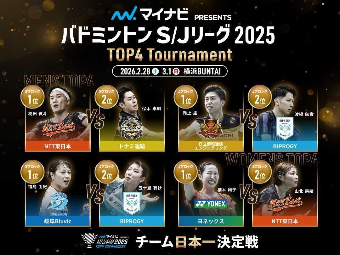 「マイナビ PRESENTS バドミントン S/Jリーグ 2025 TOP4 Tournament」が、2026年2月28日(土)・3月1日(日)の2日間、横浜BUNTAIにて開催されます。