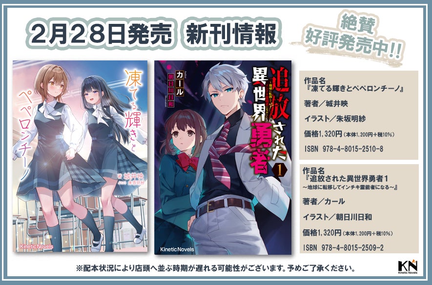 今回発売されるのは第3回キネティックノベル大賞 佳作受賞作品『凍てる輝きとペペロンチーノ』と、第5回キネティックノベル大賞 佳作受賞作品『追放された異世界勇者1 ~地球に転移してインチキ霊能者になる~』の2作品となります。