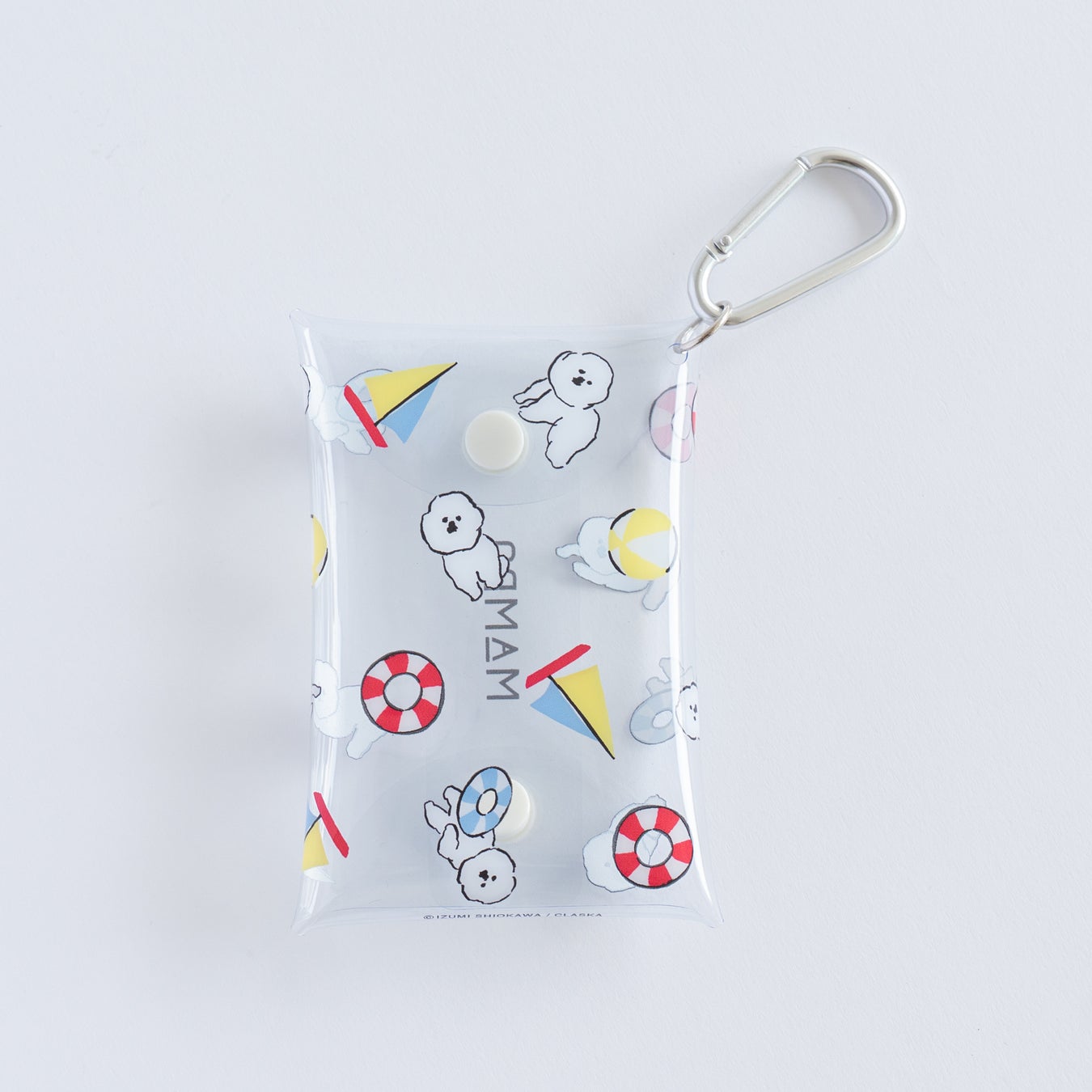 浮き輪やビーチボール、ヨットとともに、さまざまなポーズのMAMBOがプリントされたクリアマルチケース。カラビナ付きなので、リュックサックやバッグに取り付けたり、ベルトループに付けたり、お好みのスタイルでお使いいただけます。水分に強い素材なので、水辺へのお出かけ時も安心です。