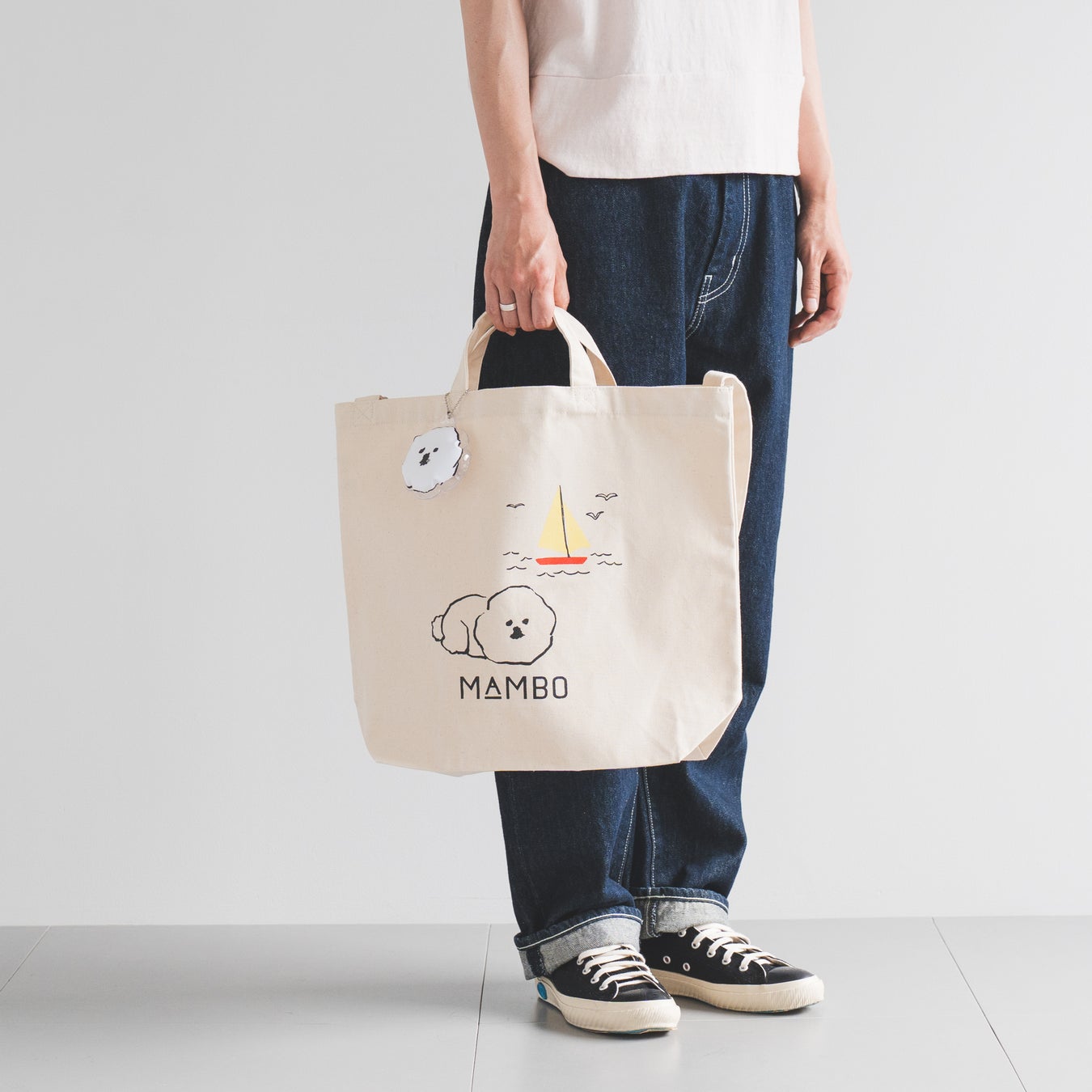 ヨットを背景に寝そべり、のんびりと寛いでいるMAMBO。肩掛けと手持ちの2WAYで使えるトートバッグです。MAMBOのチャームもセットになっている、お得な一品。夏のお出かけのお供に是非!