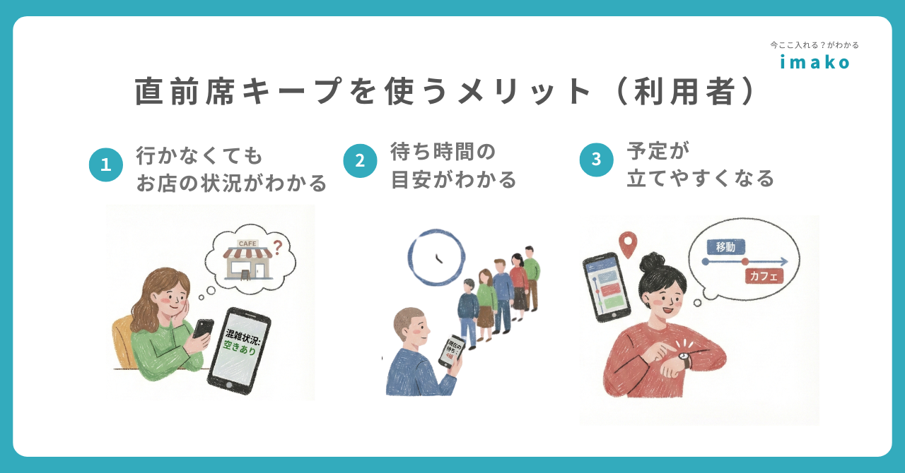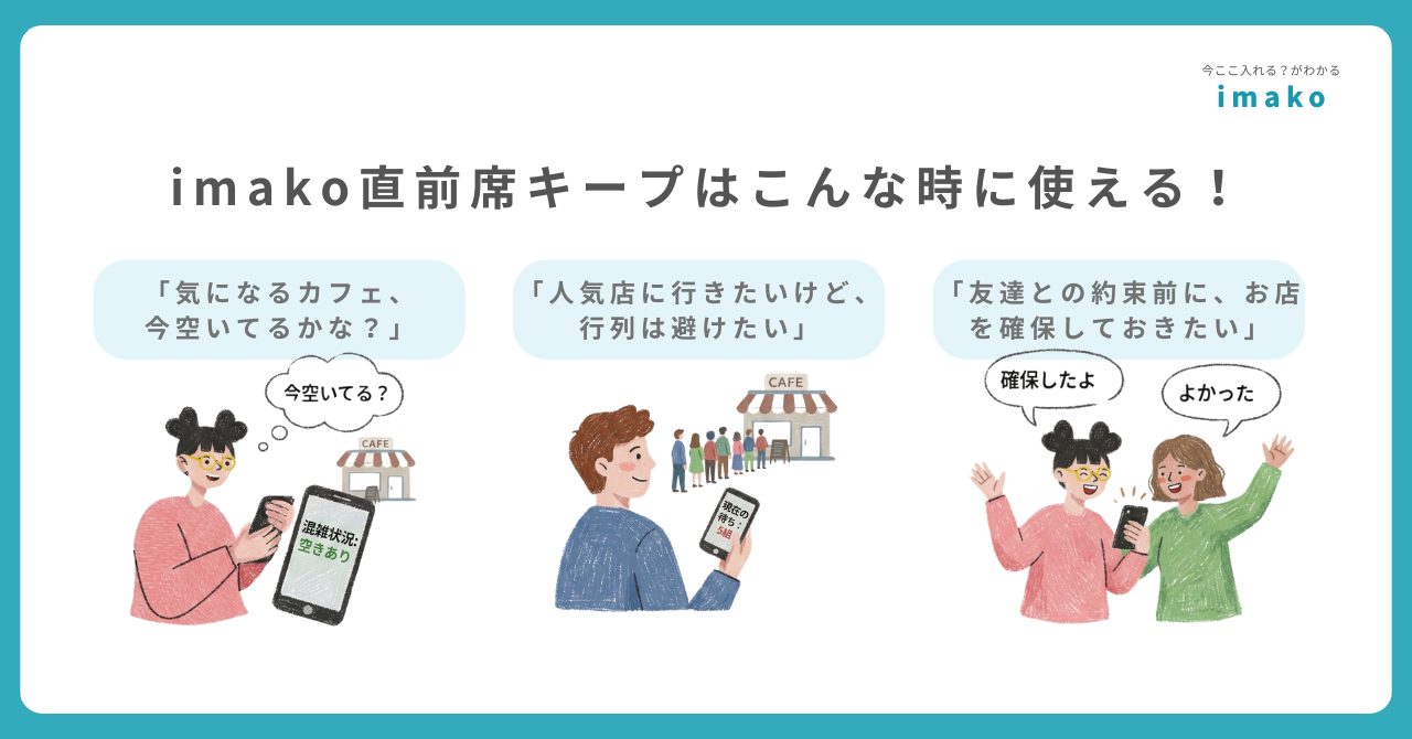 「直前席キープ」は、imakoアプリからお店を選び、簡単な操作でリクエストを送ることで、お店に15分間、席を確保してもらえるサービスです。「今から行きたい」と思ったその時に、満席を心配することなく、安心してカフェに向かうことができます。