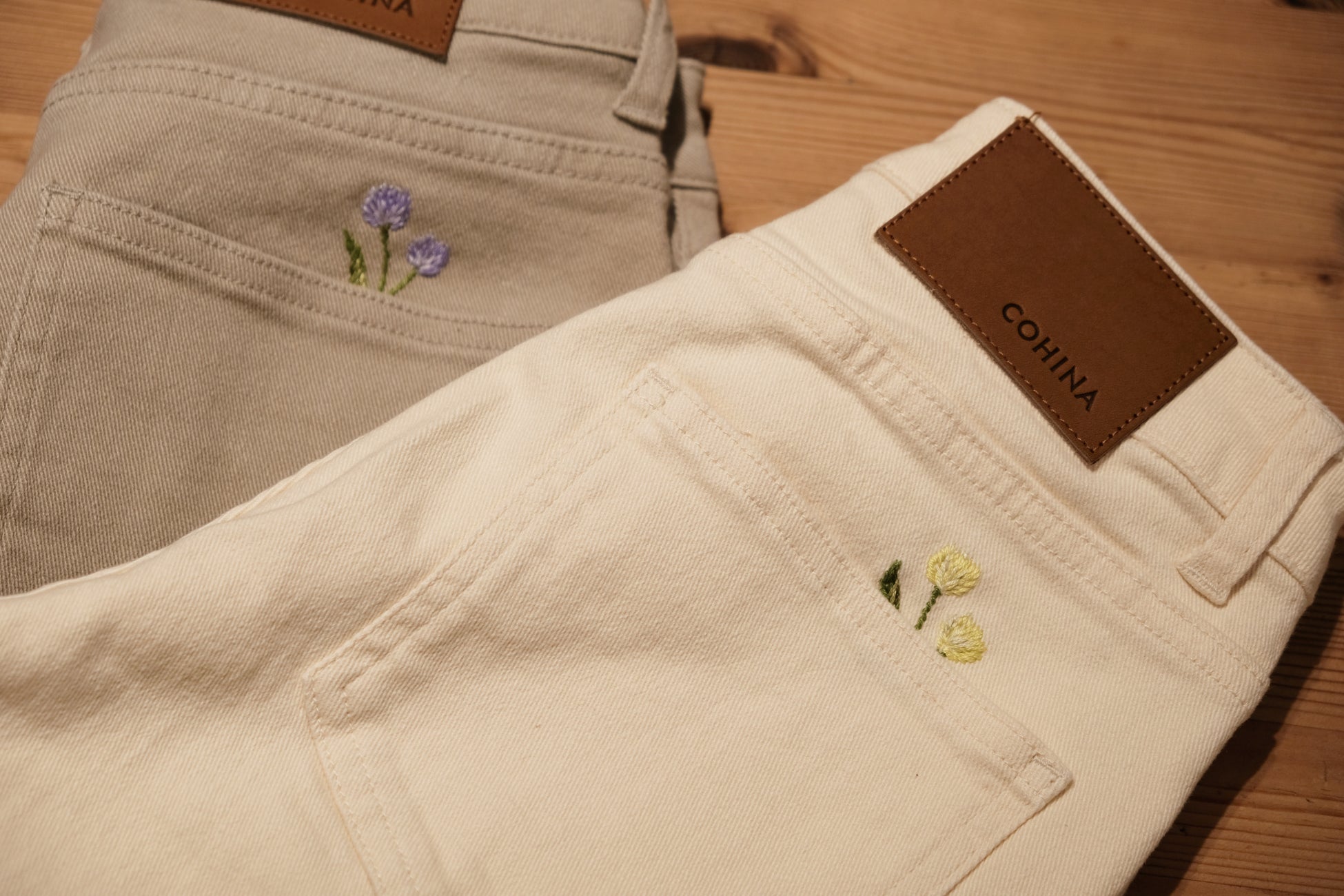 絶大な人気を誇るカラーセミワイドストレートデニムに、職人が一つひとつCOHINAロゴと「お花」の刺繍を入れた、特別な一点。