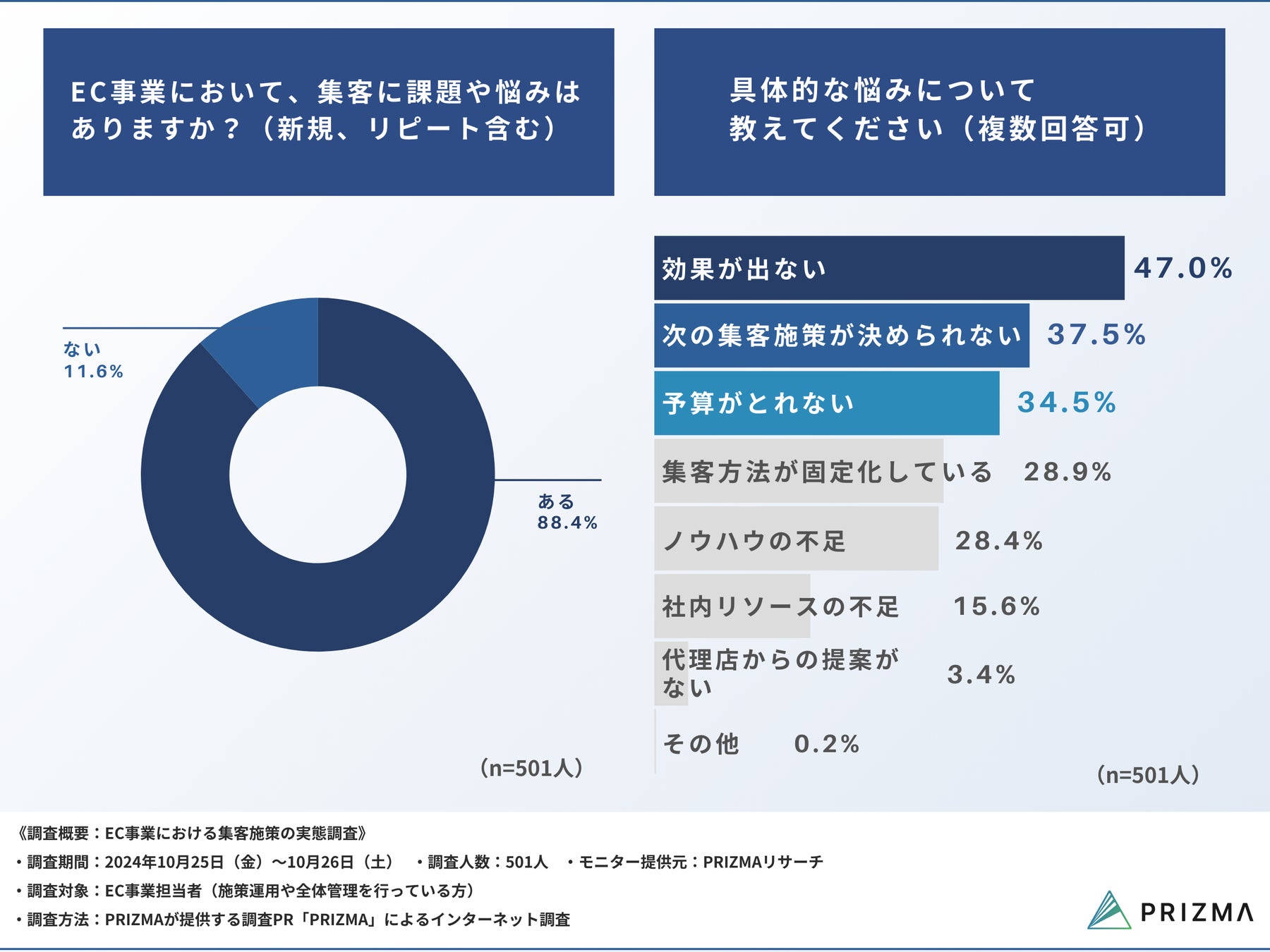 今回、株式会社PRIZMA(https://www.prizma-link.com/press)は、EC事業担当者(施策運用や全体管理を行っている方)501名を対象に、「EC事業における集客施策の実態調査」を実施しました。