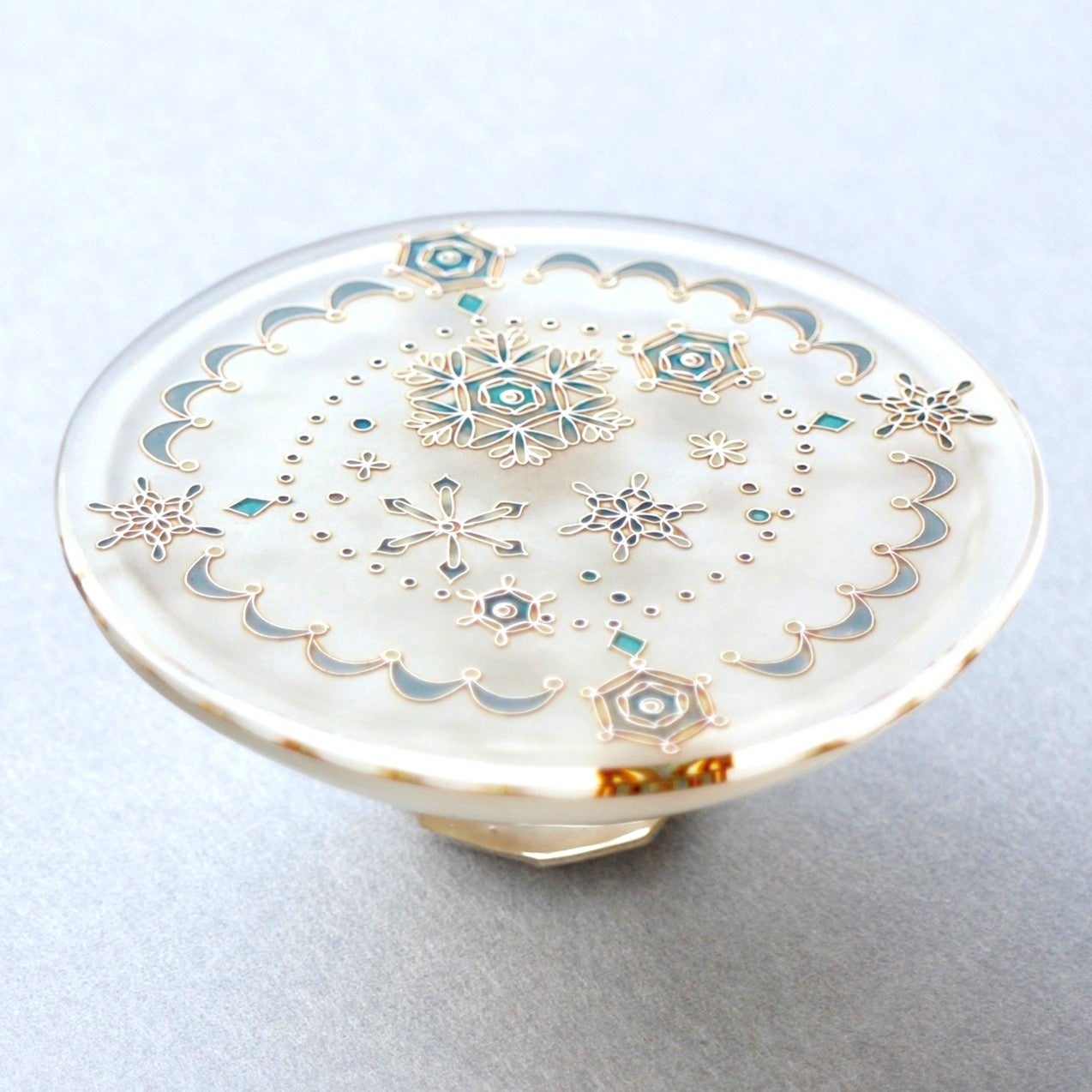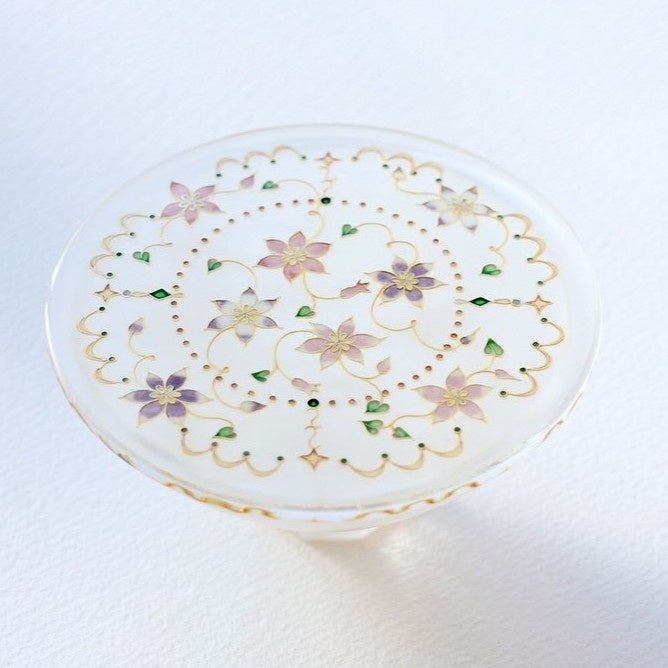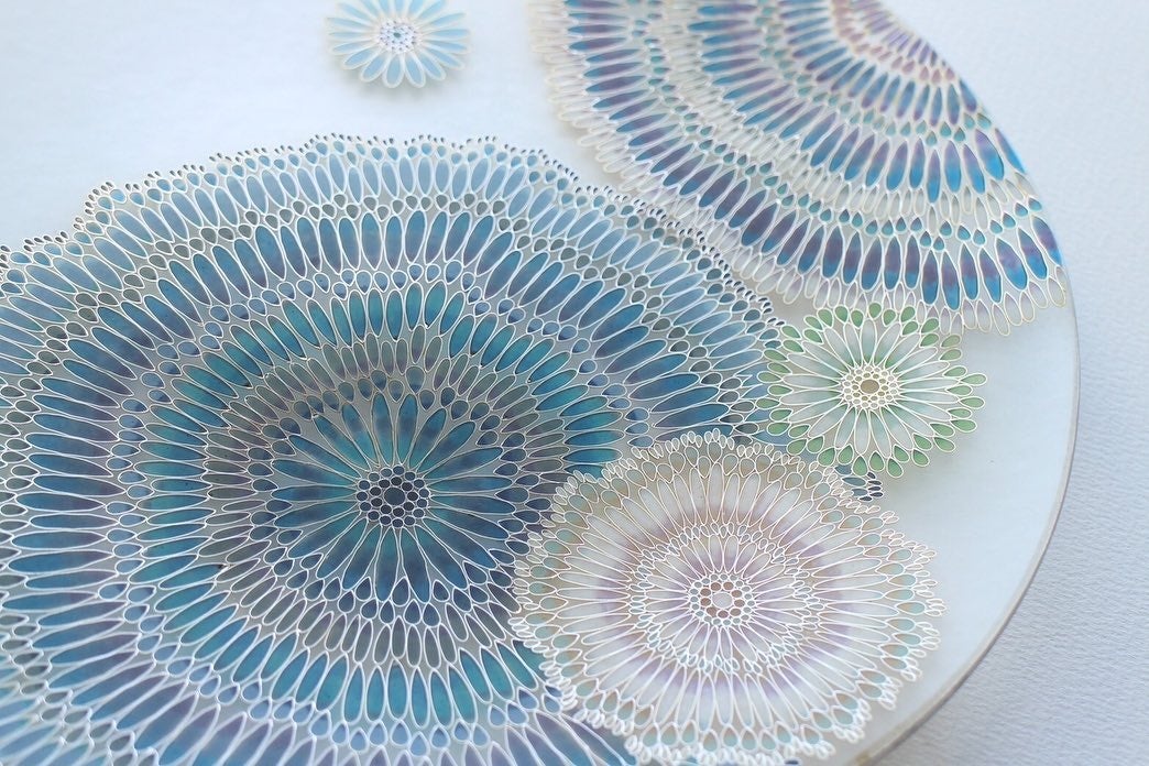 ガラスに有線七宝を施す、ガラス胎七宝という技法で制作しています。ガラスの前に、金工を勉強していたので、二つの素材を知ったことによりできる表現を模索した結果、この技法に辿りつきました。ガラスの透明感や鮮やかな色彩、銀線の繊細な線、それぞれの素材の良いところを合わせることができます。模様のデザインは、主に植物や雪の結晶などの自然をモチーフに制作しています。