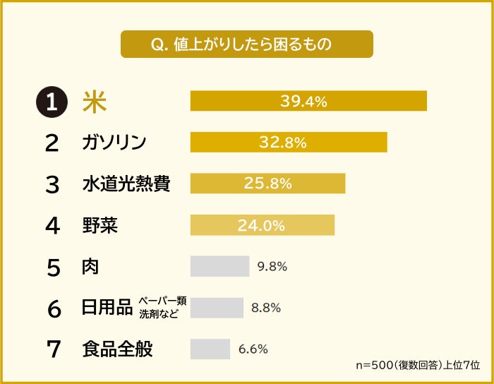 値上がりしたら困るものを聞いたところ、1位は「米(39.4%)」、僅差の2位は「ガソリン(32.8%)」でした。3位に「水道光熱費(25.8%)」、4位に「野菜(24.0%)」が続きます。