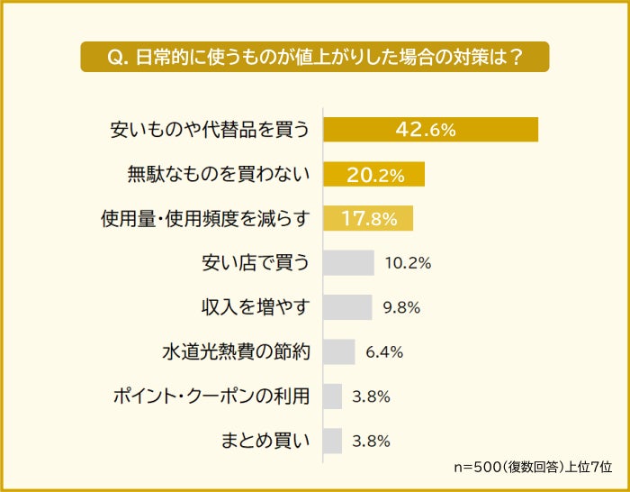 「日常的に使うものが値上がりしたときの対策」を聞いたところ、ダントツは「安いものや代替品を買う(42.6%)でした。2位「無駄なものを買わない(20.2%)」、3位「使用量・使用頻度を減らす(17.8%)」が続きます。