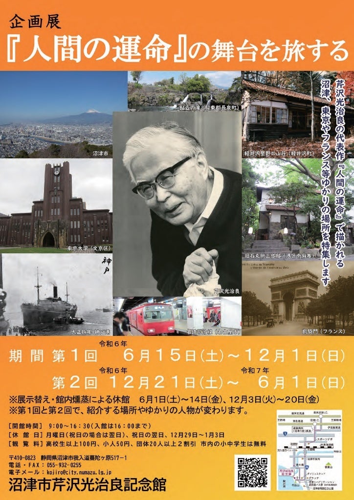 ・企画展では、沼津市に生まれ育った作家・芹沢光治良(せりざわこうじろう)の代表作『人間の運 命』において舞台となる沼津市内をはじめとした国内外各地を、主に写真パネルを通して紹介してい ます。