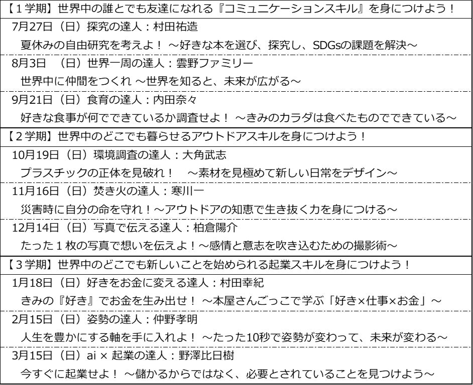 年間プログラム「達人授業 第1期」は、全9回税込み9,900円で、15組限定(大人1名、子ども1名)を6月15日(日)より募集開始します。