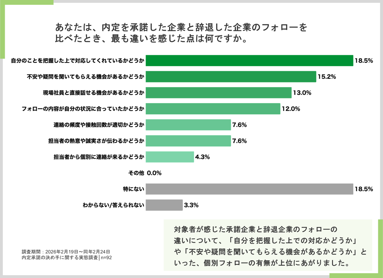 対象者が内定を承諾した企業と辞退した企業のフォローを比較し、最も違いを感じた点は、