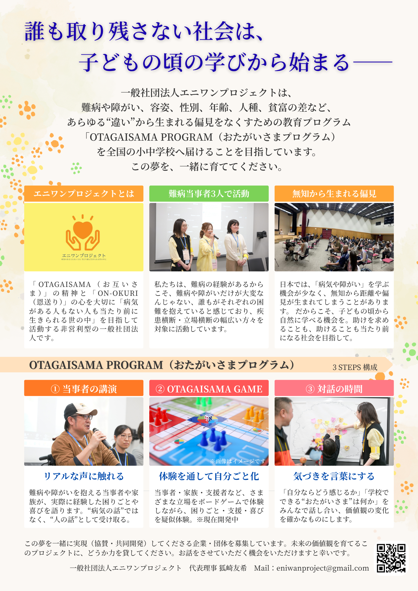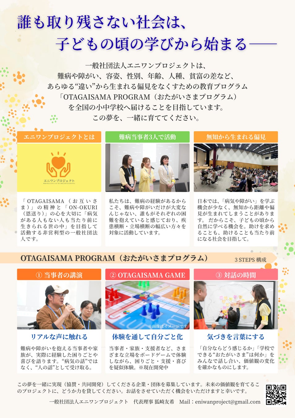 一般社団法人エニワンプロジェクト(代表理事:狐崎友希)は、難病や障がい、容姿、性別、年齢、人種、貧富の差など、あらゆる“違い”から生まれる偏見をなくすための教育プログラム 「OTAGAISAMA PROGRAM(おたがいさまプログラム)」 を全国の小中学校へ届けることを目指しています。