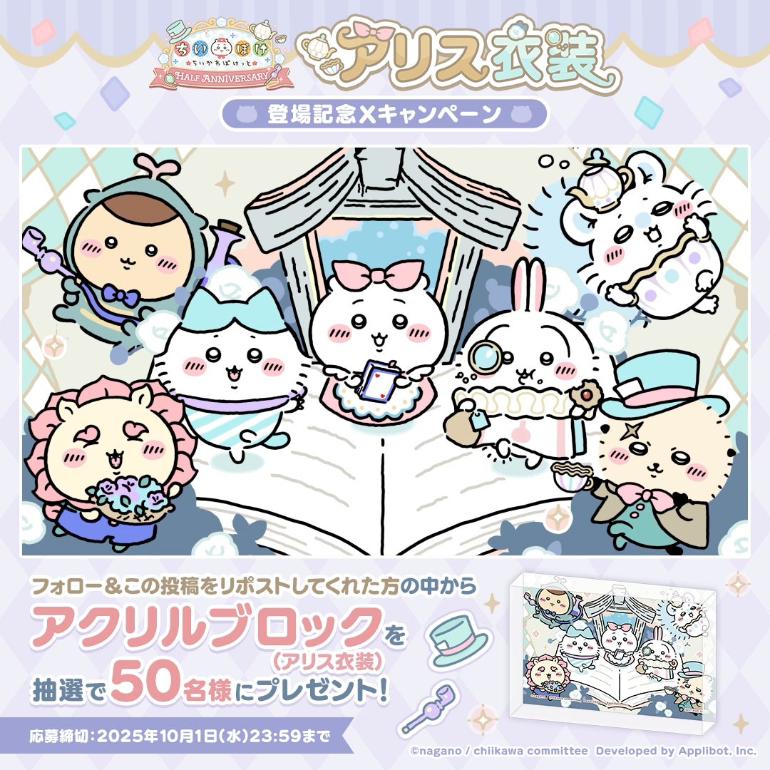 『ちいかわぽけっと』ハーフアニバーサリーを記念して、東京・名古屋・大阪でイベント開催が決定!アプリ内では「アリス」新衣装が登場、X投稿でプレゼントが当たるキャンペーンも実施!