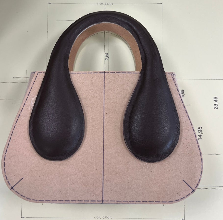 完成したハンドルは、外観と持ちやすさのバランスを取るために、隠し縫いポイントを使ってバッグに取り付けられます。