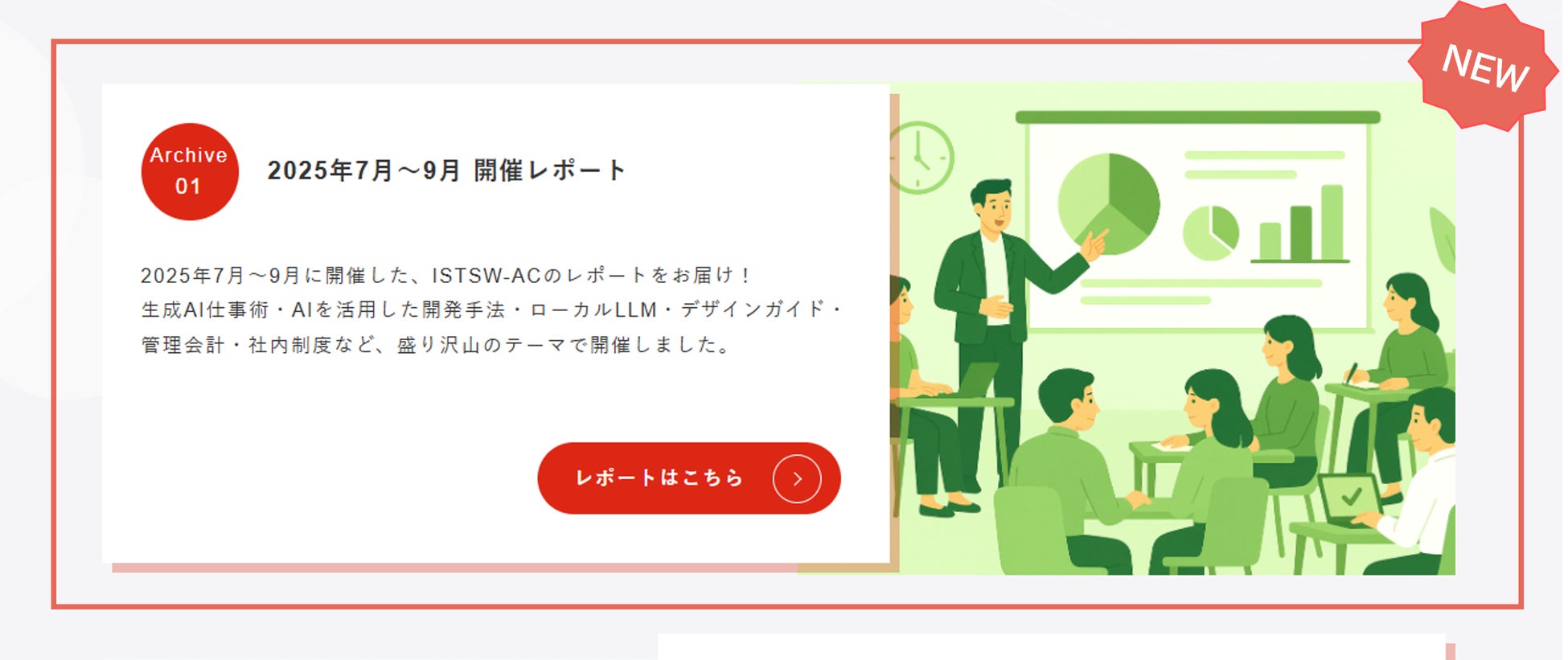 株式会社ISTソフトウェア(本社:東京都大田区蒲田5-37-1、代表取締役社長:瀬端 伸一)は、このたび、コーポレートサイトの一部を刷新し、社内技術・ナレッジを共有し、社員の学びと成長を可視化する社内勉強会「ISTSWアカデミー(ISTSW-AC)」の開催レポートを追加公開するとともに、最新の開発・導入実績を拡充しました。
