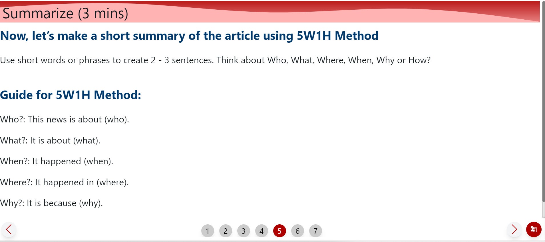 Who/What/Where/When/Why/How を使って、文章の基本情報を短くまとめる練習をしま