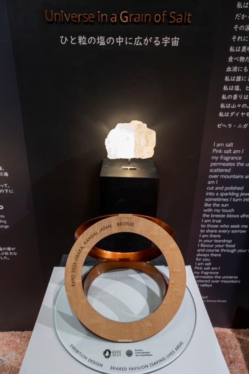 「いのち輝く未来社会のデザイン」をテーマとする2025大阪・関西万博において、パキスタンパビリオンは、アーティストのヌールジャハーン・ビルグラミ氏がキュレーションを担当し、パキスタンの文化・鉱物資源・伝統工芸・創造性を総合的に紹介しました。メイン展示「Universe in a Grain of Salt(ひと粒の塩に宿る宇宙)」では、パキスタン産のピンク岩塩を用いた幻想的な演出が話題を呼び、国内外から高い評価を得ました。