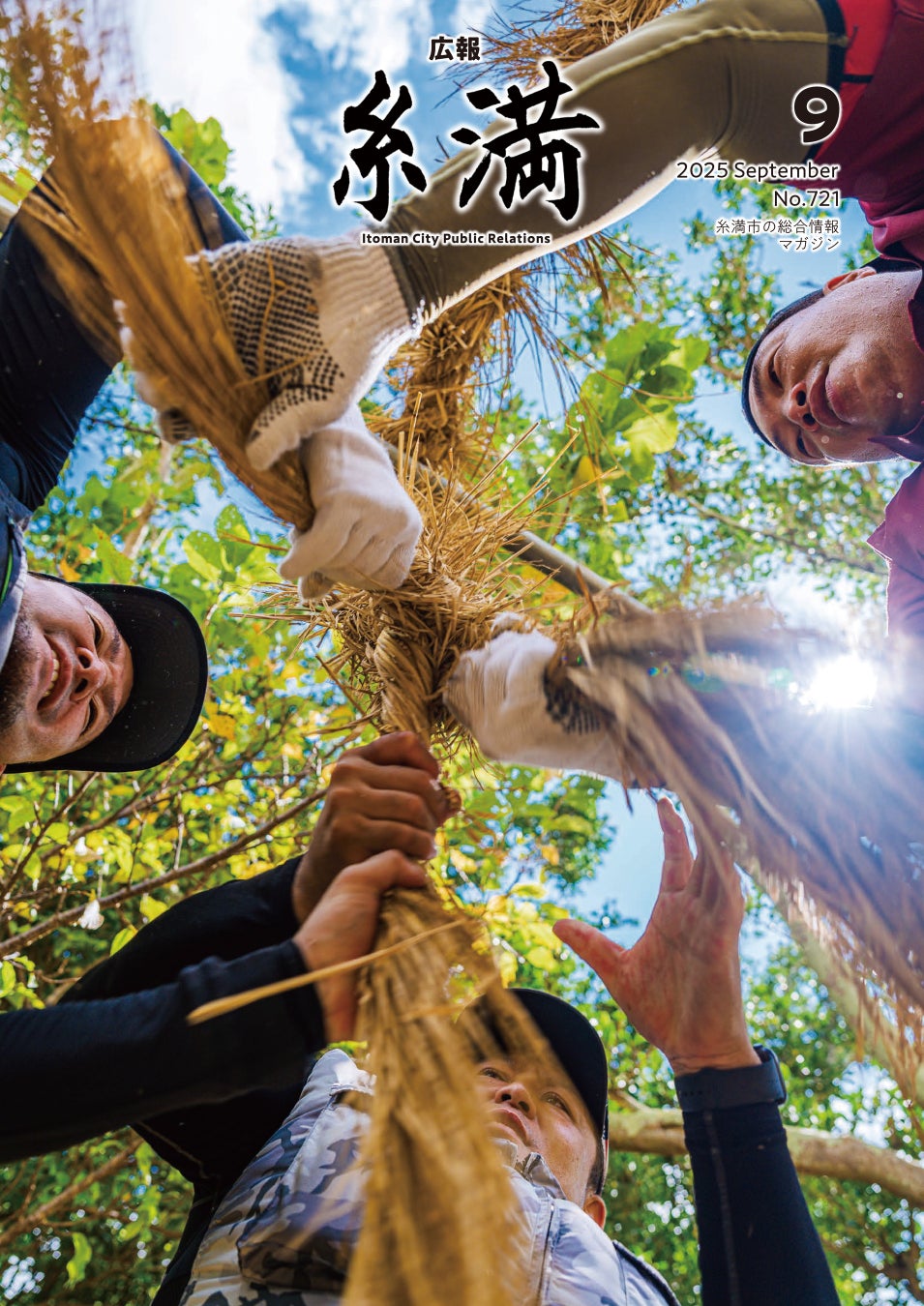 藁不足やコロナ禍を経て10年ぶりに行われた与座大綱引きの縄作りを、低い視点から力強く捉えた一枚。結われていく縄と人の表情から継承への意志が伝わり、逆光下でも空気感まで感じさせる、写真の力が際立つ表紙です。(兵頭)