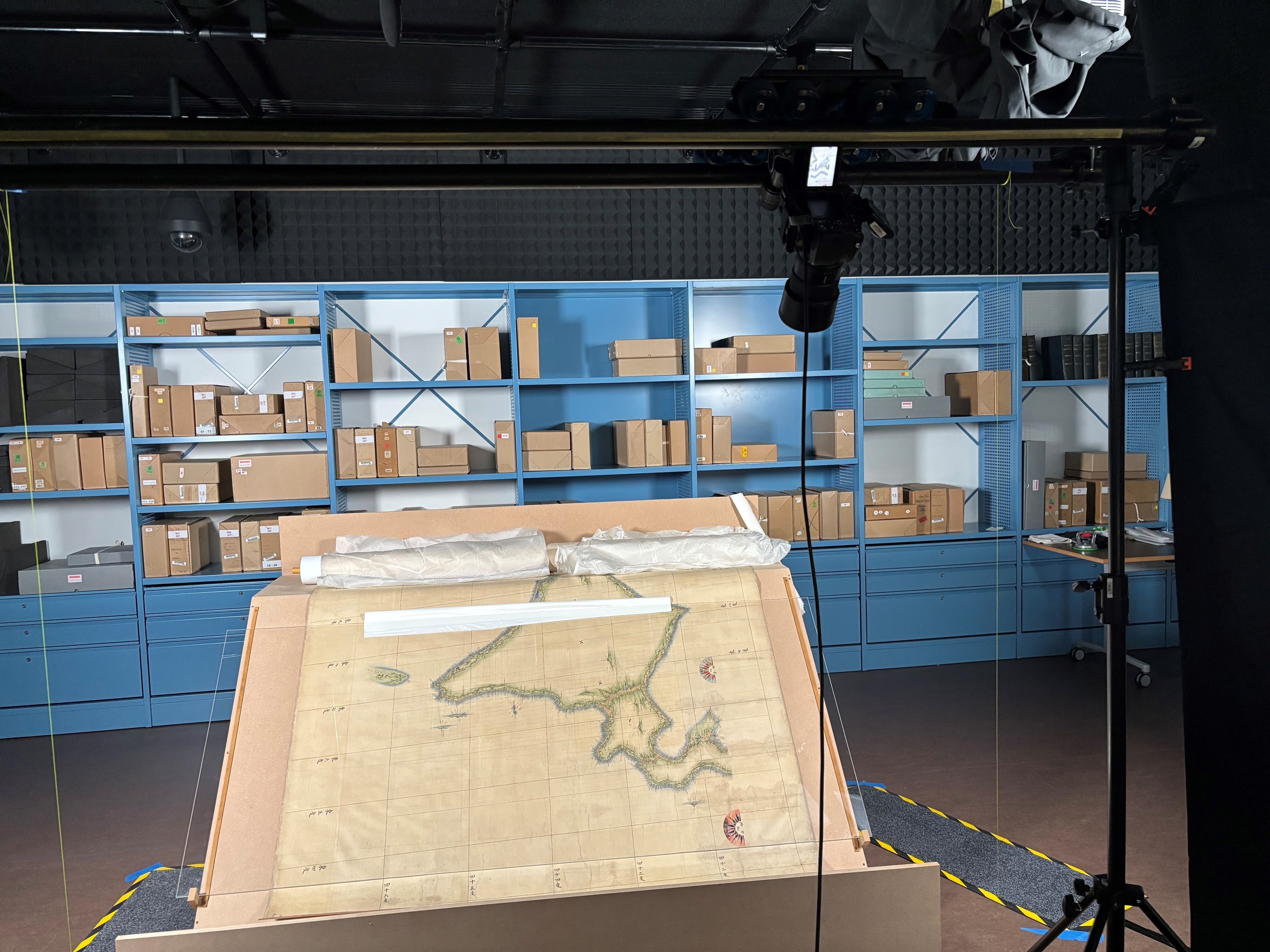 英国国立公文書館での撮影に際しては貴重な原図を傷つけないよう特別な撮影台を制作し、その上に原図を設置して撮影しています。