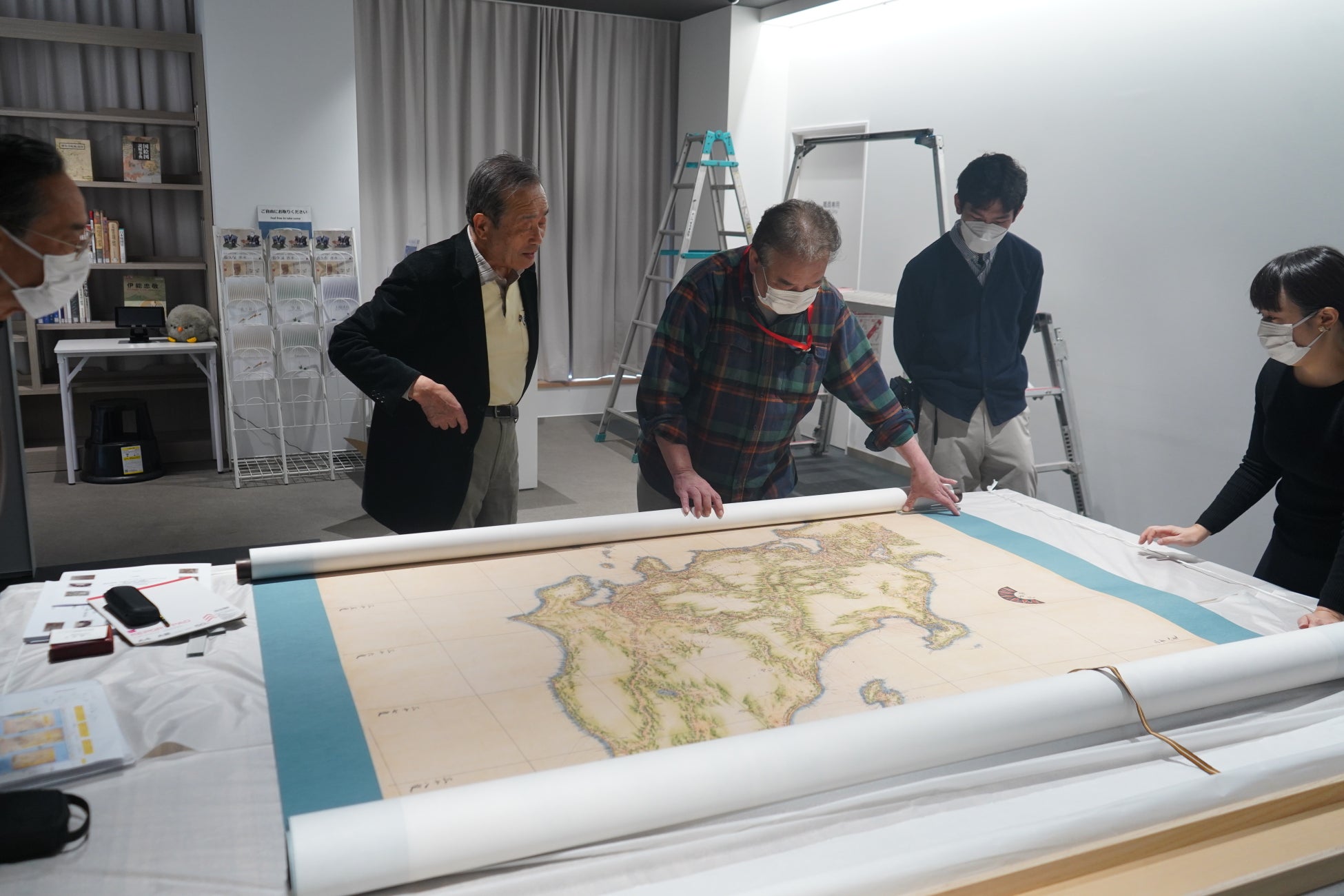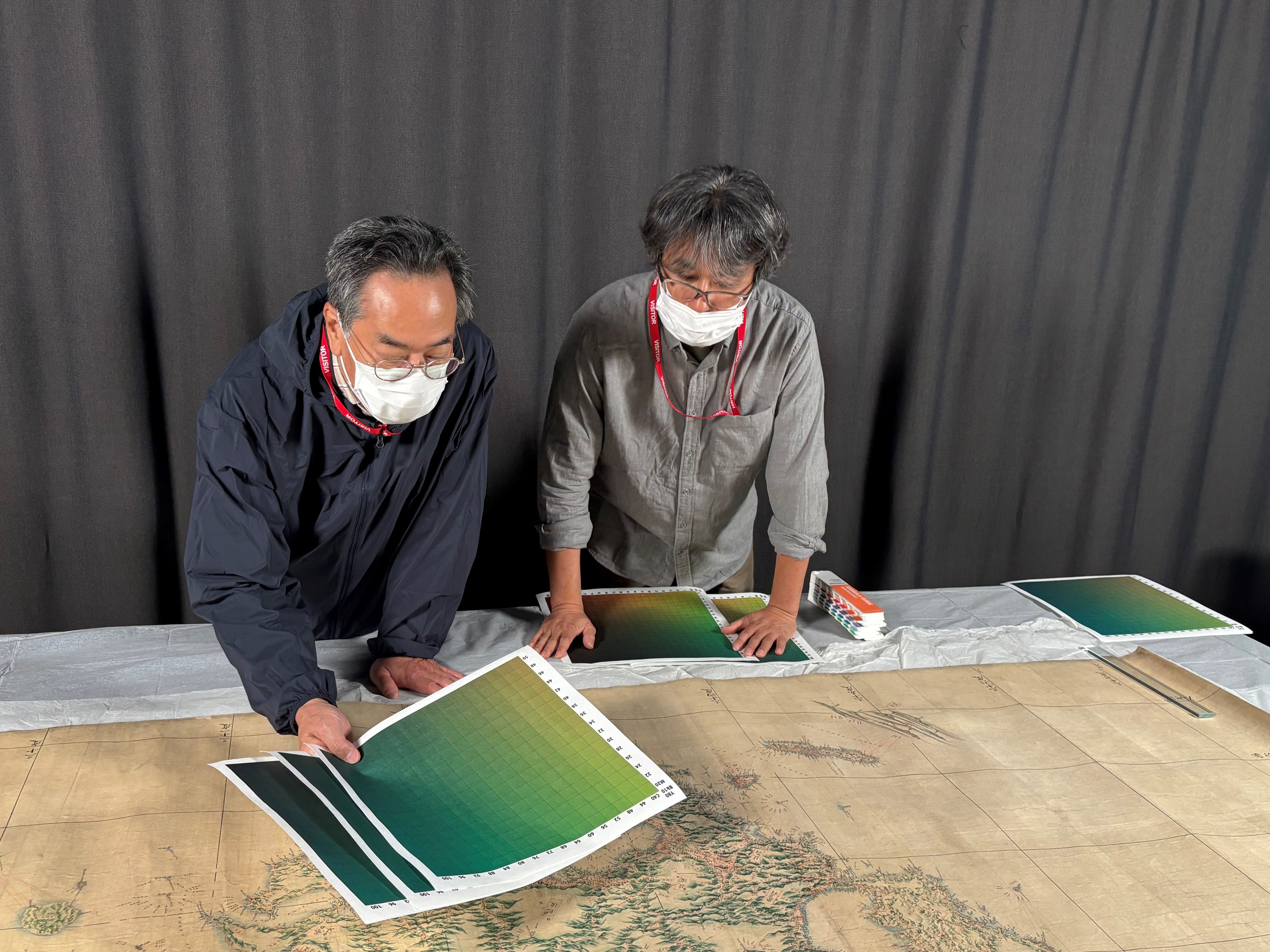内閣官房領土・主権対策企画調整室では、領土・主権展示館のゲートウェイホールの目玉の一つとなる常設展示として英国伊能小図の実物大レプリカを制作することを計画し、英国国立公文書館の許可を得て、2025年9月に、英国伊能小図を詳細に撮影し、同データを統合した画像データをもとに今回の実物大レプリカを制作しました。