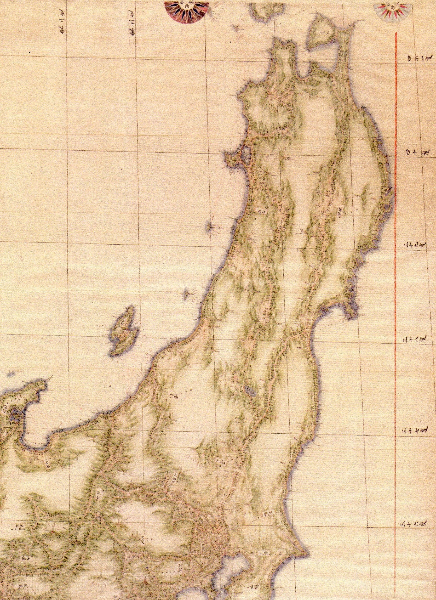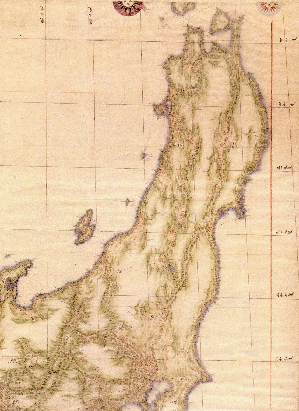 北海道の一部を除く日本全域の海岸線が朱色で太くなぞられています。これは海図への転写を容易にするためのものと推測されます。