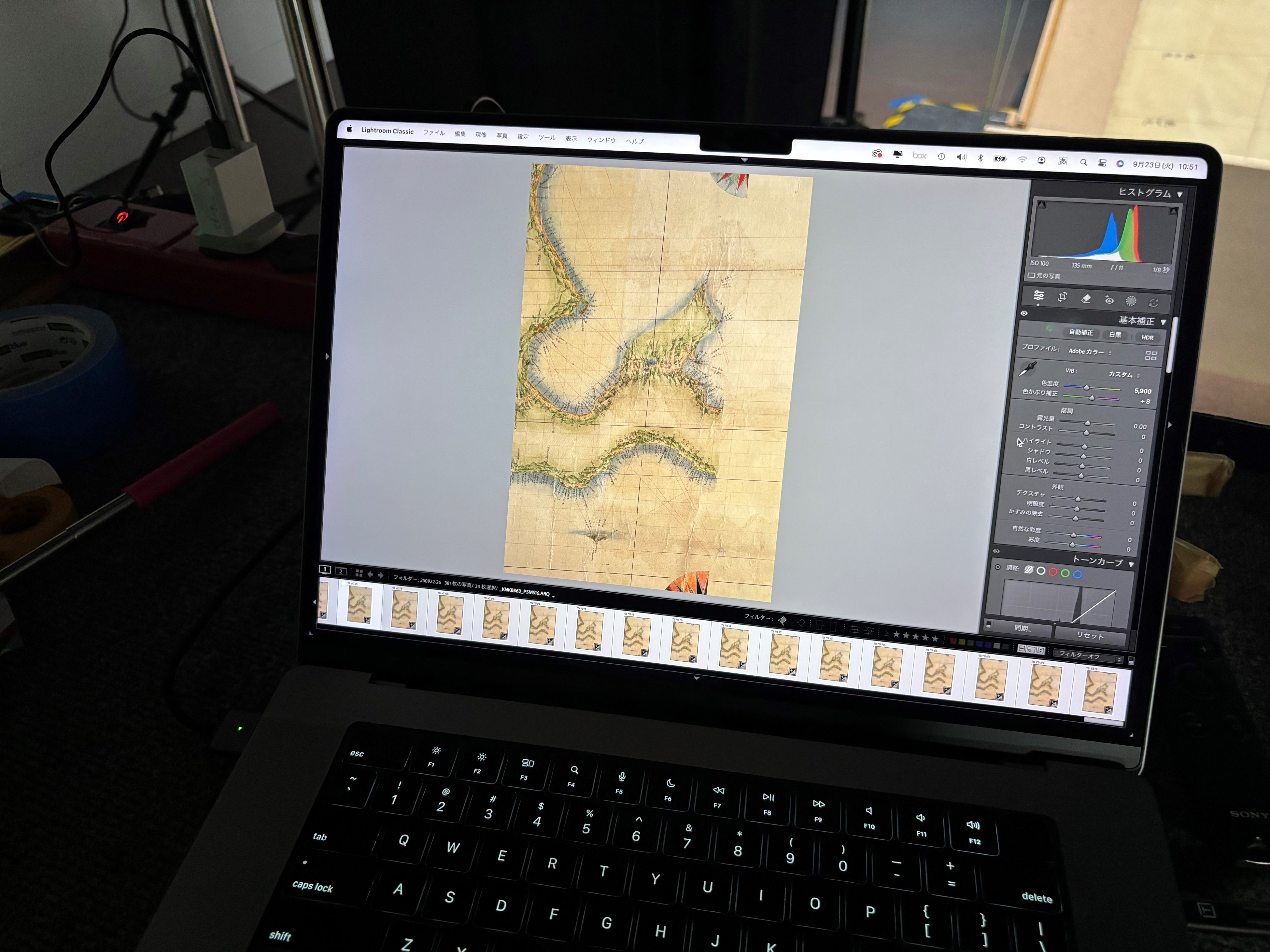 (左上から3枚)今回制作した特別な撮影台、この撮影台に英国伊能小図を載せて撮影。カメラを動かすことで部分々々の撮影を行い、後に統合して地図全体のデータを制作する。