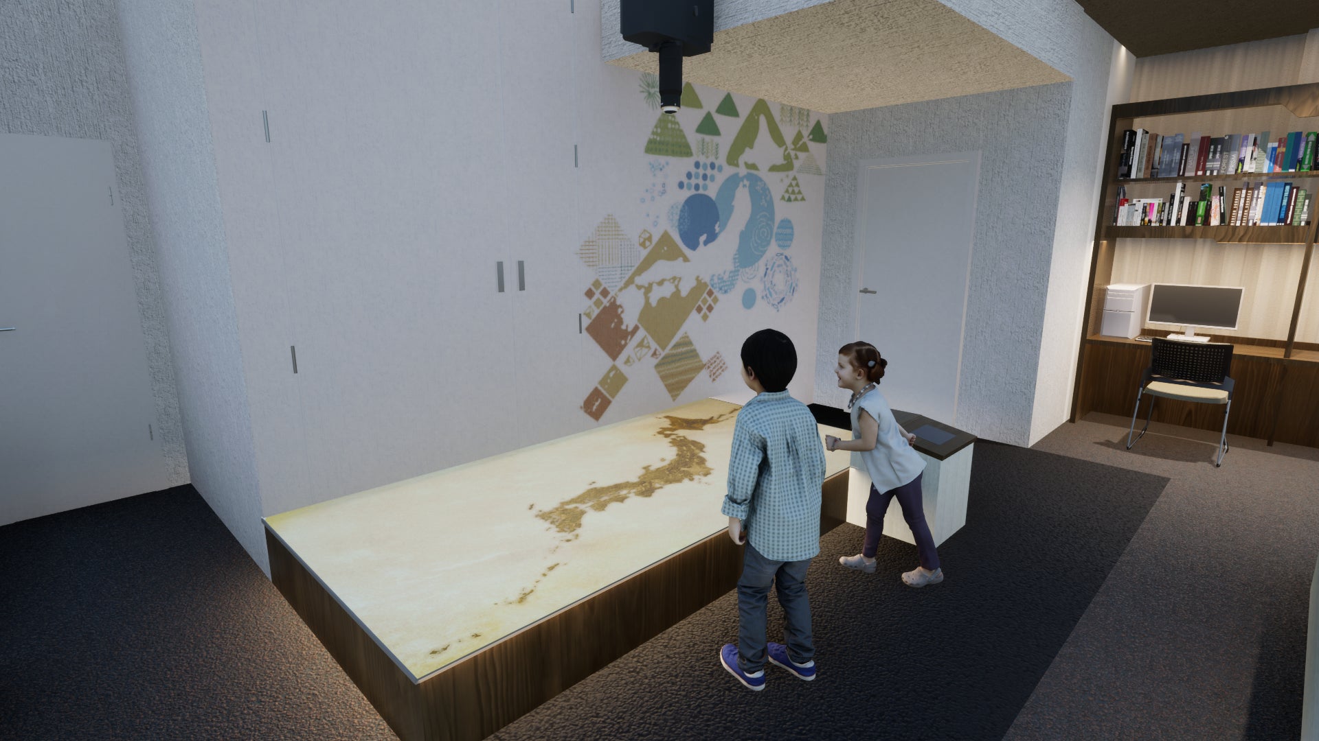 また、ゲートウェイホールの設計にあたって英国伊能小図の配置をあらかじめ考慮し、非常に大型の地図でありながら、壁に垂直な形での展示を実現しました。また、大型な地図であることを考慮し、地図の右にある「デジタル日本地図コーナー」にて、同図のデジタルデータを詳細に確認できる環境を整備しています。