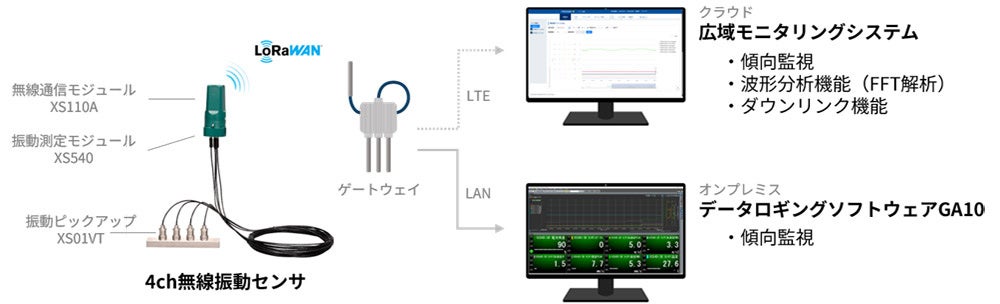 本製品は、無線通信モジュールと振動測定モジュール、最大4つまで接続できる振動ピックアップで構成されます。振動ピックアップを5メートルのケーブルで接続する構成としたことで、従来は設置が難しかった狭いスペースや高温となる環境下の設備のデータ取得が可能です。さらに、取得したデータを当社のクラウド型ソフトウェアで分析することで、故障箇所や故障原因特定の支援、保全効果の可視化が可能となり、より迅速な判断と高度な意思決定をサポートします。