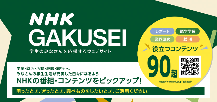 学生生活が充実した日々になるよう、NHKの多彩な番組や情報でサポートします。ぜひ、こちら (https://www.nhk.or.jp/gakusei/) からアクセスしてください。
