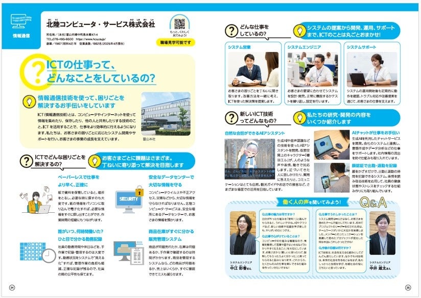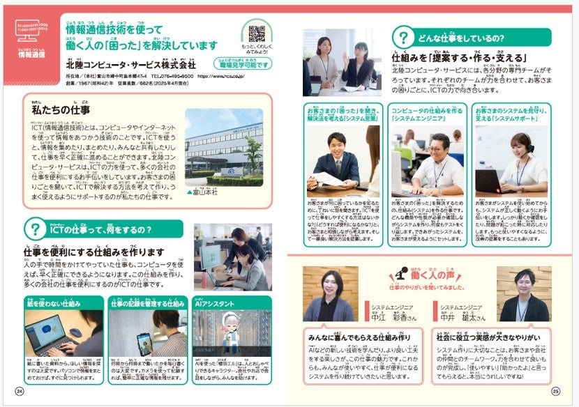 「お仕事ノート(小学生用)」「お仕事ブック(中学生用)」は文部科学省が推進するキャリア教育の副教材として、教育委員会の支援を得て、株式会社中広が発行し、市区町村単位で配布されています。地域企業の仕事が具体的に紹介されており、子供たちが将来の夢を描くきっかけを提供しています。弊社はこの趣旨に賛同し、富山市2026年度版に協賛しました。弊社の紹介ページでは、ICTの力を用いて課題を解決する仕組みを具体的な事例とともに紹介しています。今後も地域と社会の持続的な発展に寄与する活動を継続してまいります。