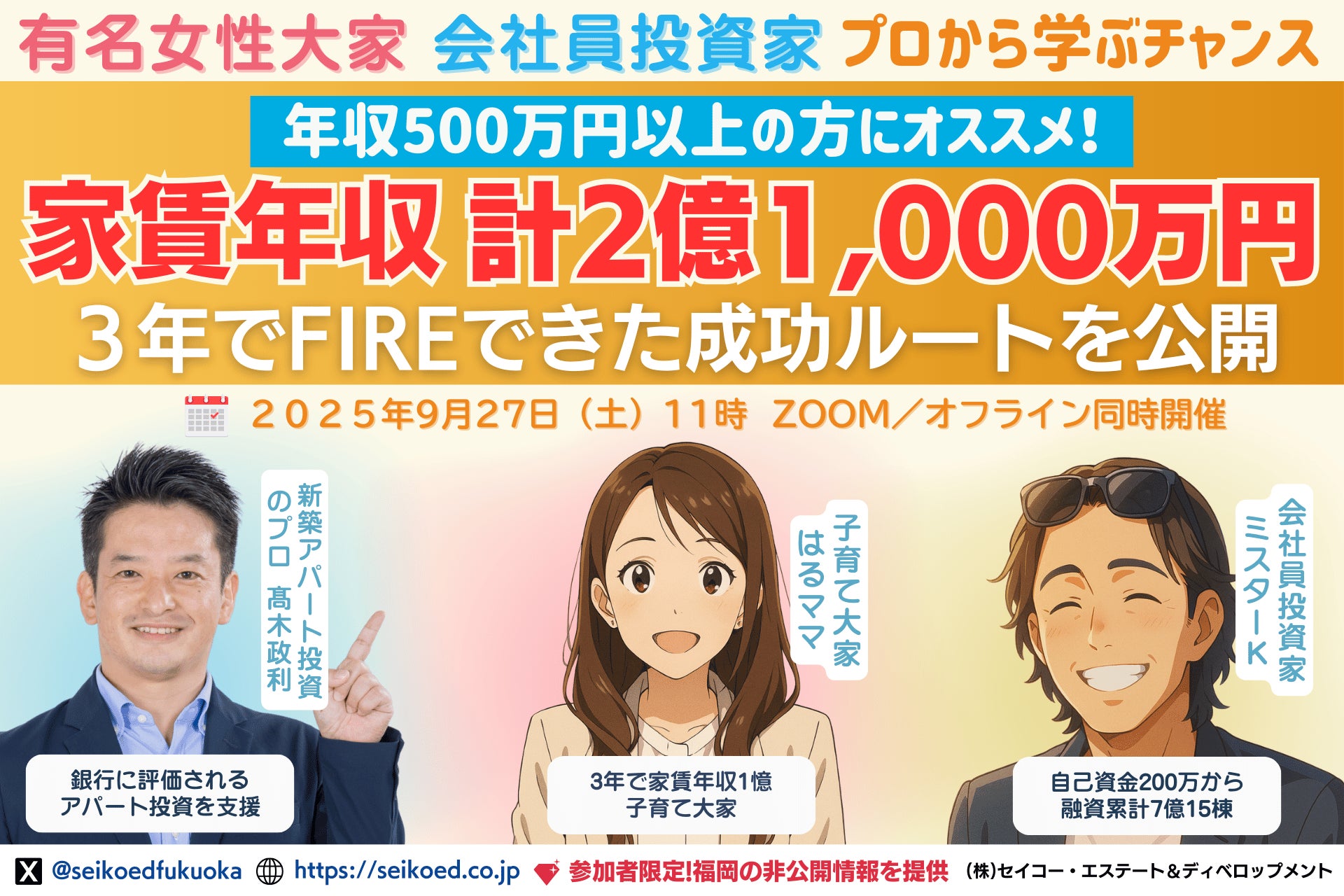 株式会社セイコー・エステート&ディベロップメント(本社:福岡市、代表取締役:高木政利)は、福岡で不動産投資や新築アパート投資を考えている人に向けて、2025年9月27日(土)に「短期FIREを実現した成功者から学ぶ不動産投資セミナー」を開催いたします。登壇するのは、シングルマザーで子育てをしながら家賃1.6万円生活から家賃年収1.6億円に達した有名女性大家「はるママ」と、自己資金200万円から7億円の融資を獲得し15棟を所有するサラリーマン投資家「ミスターK」。現役投資家のリアルな経験をもとに、不動産投資の順番と銀行融資を獲得するための戦略を学べる貴重な機会です。